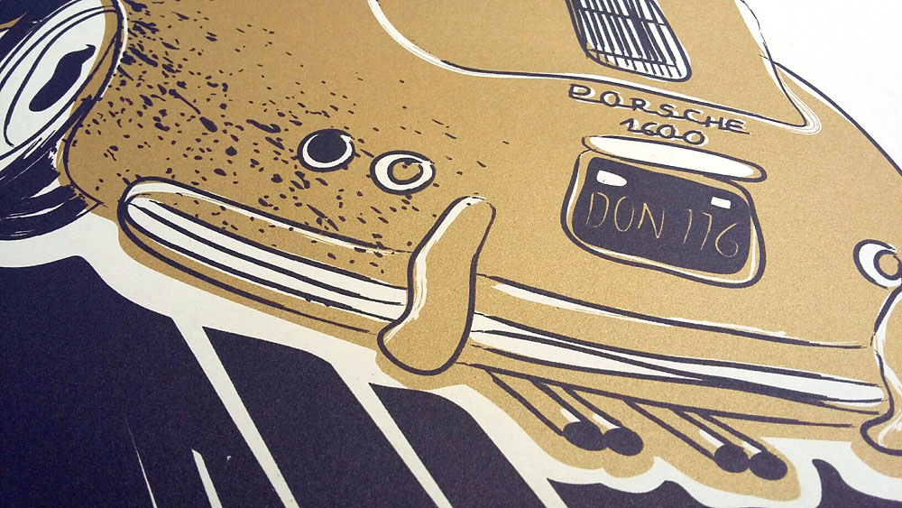 Le serigrafie di Antoine Gaslais sono fatte di linee e colori semplici intessuti a sentimenti puri. Forme stilizzate dalla velocità, lettering che riporta ai manifesti delle 24 Ore di Le Mans. Sensazioni che Gaslais trattiene e stampa attraverso il telaio del vissuto. ‘Ogni vecchia auto ha la sua storia, che poi s’interseca con quella della persona che se ne prende cura. Con il suo boxer quattro cilindri da 90 cavalli, la ‘piccola 911’ sembra fatta apposta per me‘.