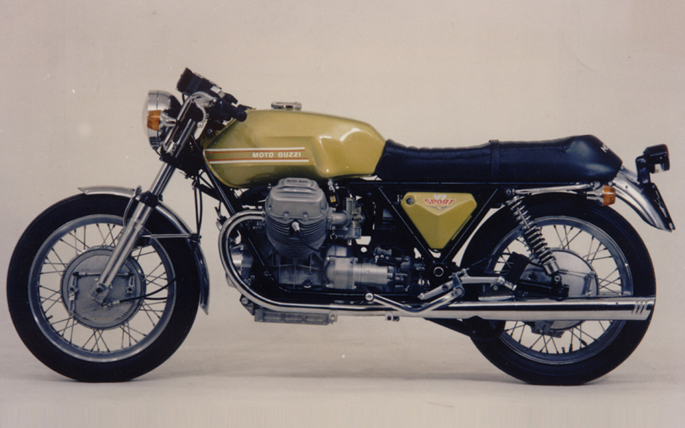 V7 Sport 750 – Progettata da Lino Tonti, nacque nel 1971, quattro anni dopo la morte del fondatore Carlo Guzzi. Bassa, con motore bicilindrico a V, 70 cavalli di potenza, gran tenuta di strada, divenne subito un culto perché la prima al mondo a superare i 200 chilometri all'ora, sbaragliando tutte le concorrenti dell'epoca. È considerata un capolavoro di dinamica grazie all'integrazione fra motore e telaio, ed è in commercio ancora oggi, nella versioni Racer e Stone. (Credits: Moto Guzzi)