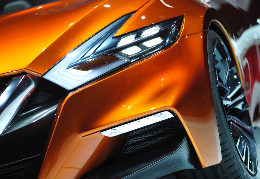 Dettaglio del faro anteriore sinistro della Nissan Sports Sedan. Detroit, 13 gennaio 2014