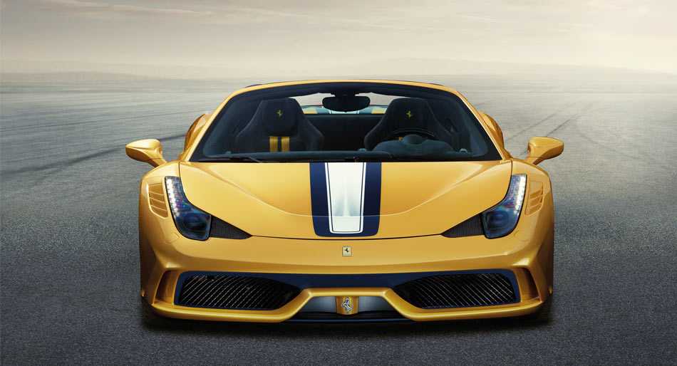 Ferrari 458 Speciale A – Realizzata in serie limitata (499 esemplari), si presenta come una delle regine della kermesse parigina, in una riconoscibilissima livrea giallo Modena, con banda centrale blu e bianca. È la più performante spider della storia del Cavallino. Con il suo V8 da 4,5 litri e 605 cavalli arriva a 100 km/h in 3 secondi, e può raggiungere i 325 km/h di velocità. (Credits: Ferrari)