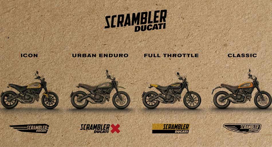 Sono previsti quattro allestimenti. Icon è la versione con dotazione ‘base’, in giallo e in rosso; Classic, con parafango posteriore e uno spirito seventies marcatissimo; Urban Enduro, con telaio nero, fronte di ispiraizone motard, coda tronca e colorazione un po’ militare; Full Throttle, più sportiveggiante, gialla e nera con doppio scarico più basso.