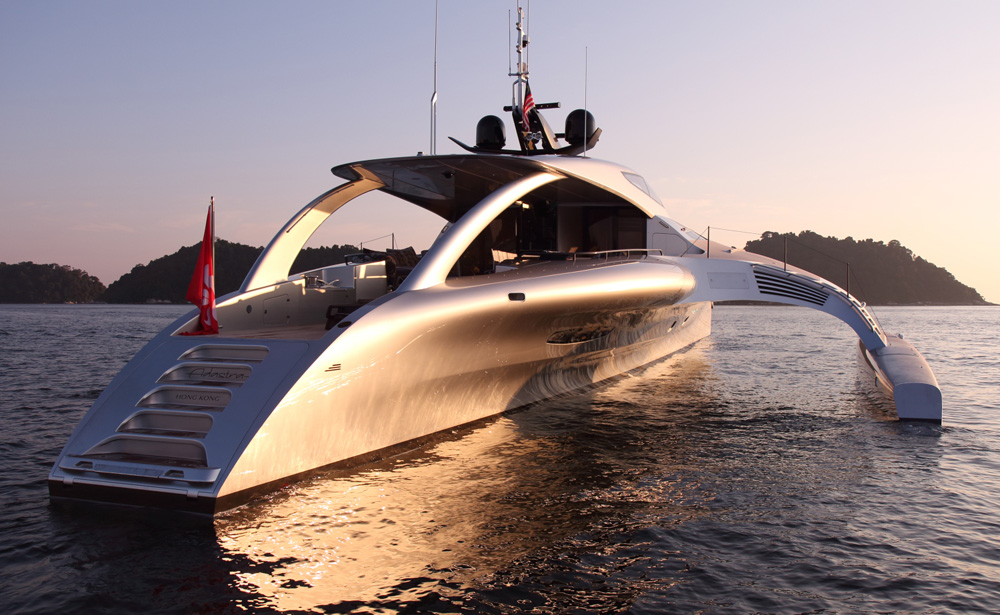 Tra i moderni yacht, l’Adastra è senza dubbio uno dei più originali grazie al suo design futuribile: sembra un’astronave atterrata in mare direttamente da un film di fantascienza. Per l’esattezza si tratta di un trimarano a motore, una soluzione insolita nel mondo del diporto di lusso.