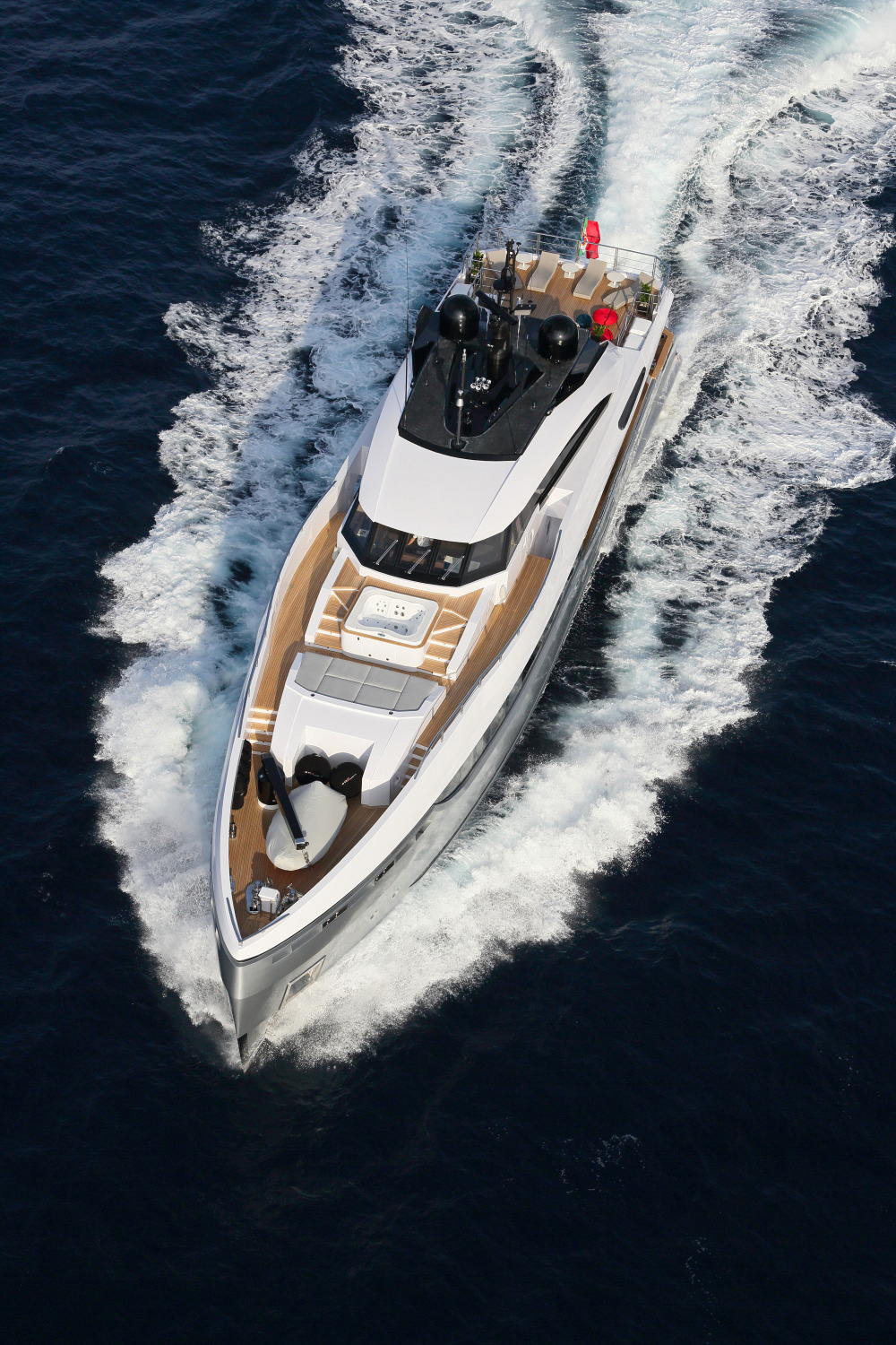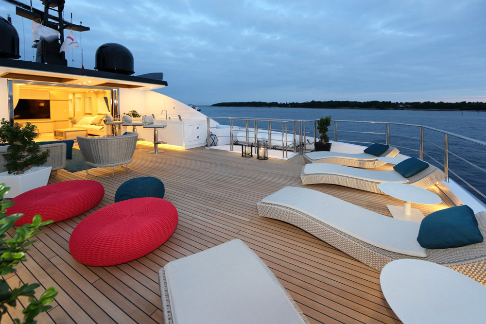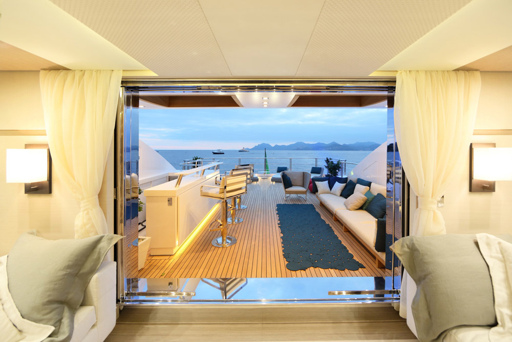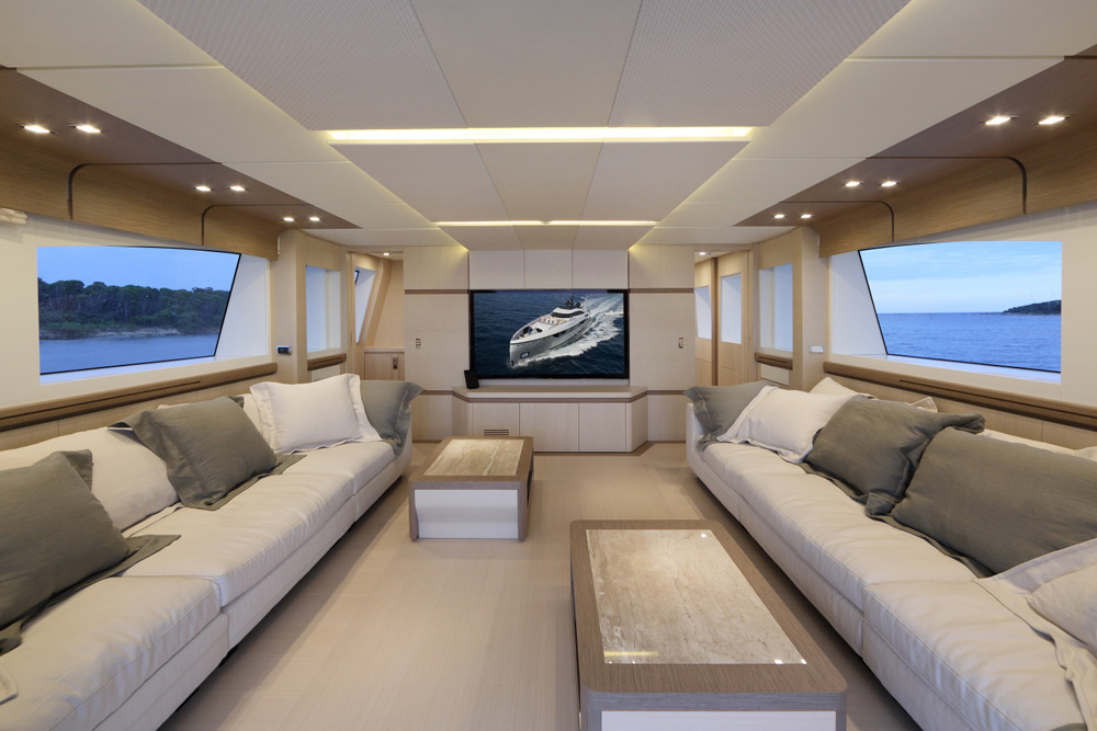 Negli interni, dove prevalgono i colori chiari e i materiali eco-friendly, la regola seguita dallo studio di design Hot Lab è quella dell’armonia e dell’equilibrio degli spazi; gli ospiti, fino a otto, sono distribuiti in quattro cabine luminose. Sul secondo ponte, a poppa, si apre un’ampia zona sole e relax, mentre a prua si trova una vasca idromassaggio. Sotto, il piccolo spazio a ridosso del garage per il tender è dedicato a un salottino più intimo.