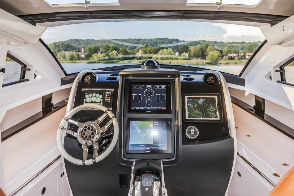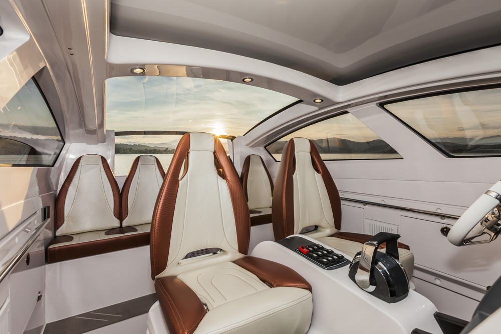 Il richiamo al mondo delle quattro ruote ritorna anche nella struttura centrale, il cuore della 44GT: i sedili di pilota e copilota, separati, potrebbero venire dritti da una Jaguar o una Maserati; alle spalle della postazione di comando si trovano altri quattro sedili dal design affine. Il grande tetto in cristallo si apre con un veloce sistema automatico, e anche la vetrata posteriore si ritira scomparendo in sala macchine.
