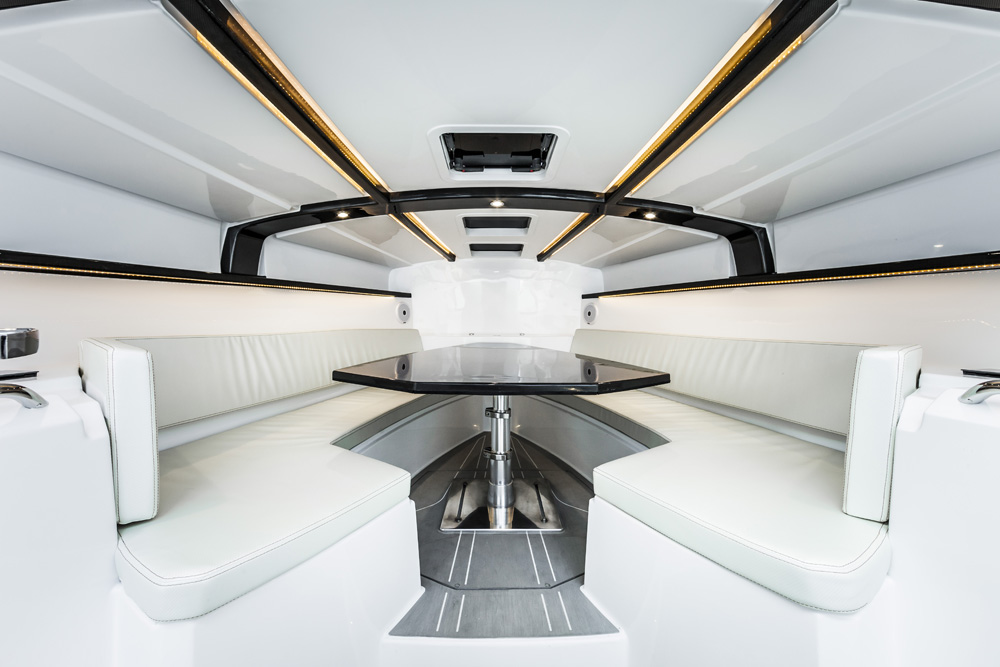 Scendendo sottocoperta si trovano un divano a V (con tavolino abbassabile), che può essere trasformato in un letto doppio, la cucina, il mobile bar e un bagno con doccia a pioggia. Comodità e lusso fino all’ultimo particolare.