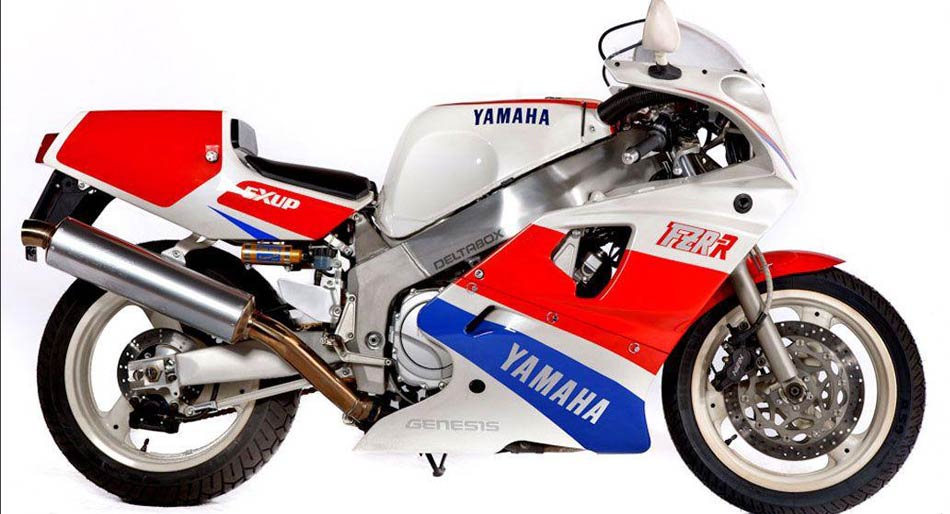 1989 – FZR 750 R – Dopo le enduro degli anni Settanta, Yamaha si afferma in tutto il mondo con le stradali veloci che impazzano lungo tutti gli ottanta. Telaio Deltabox per distribuire meglio peso, circolazione dell’aria e aerodinamica, linea compattissima, grafiche brillanti, la piccola bomba del diapason spinse i centauri che la possedevano ad affrontare anche la pista. 750 cc, 4 cilindri e 121 cavalli, correva leggera ma in sicurezza, grazie ai tre freni a disco. (Credits: Yamaha)