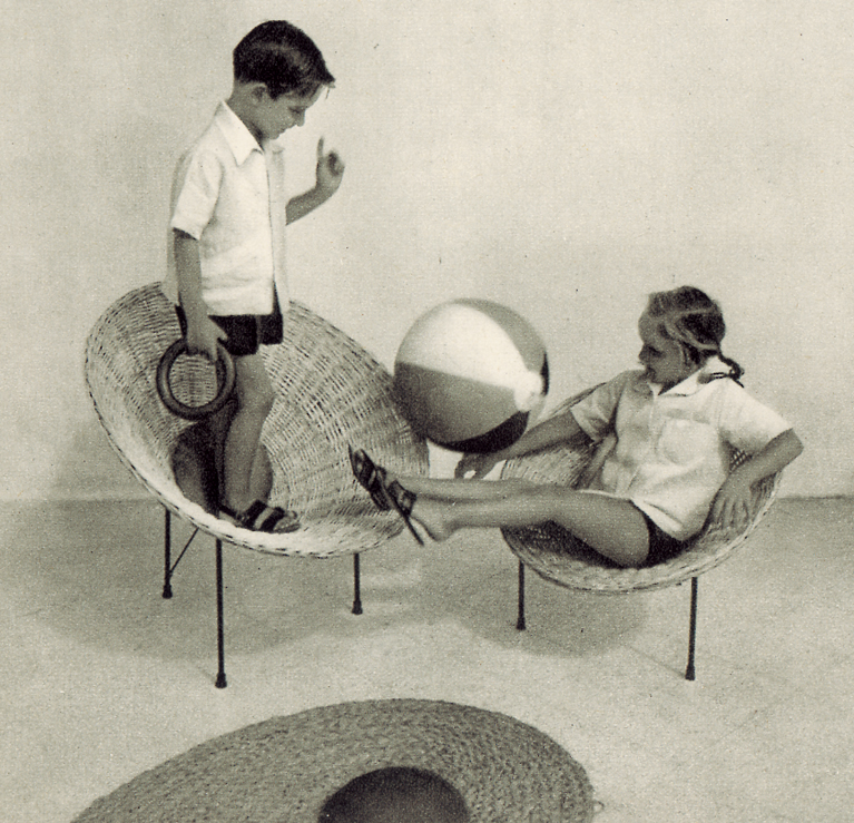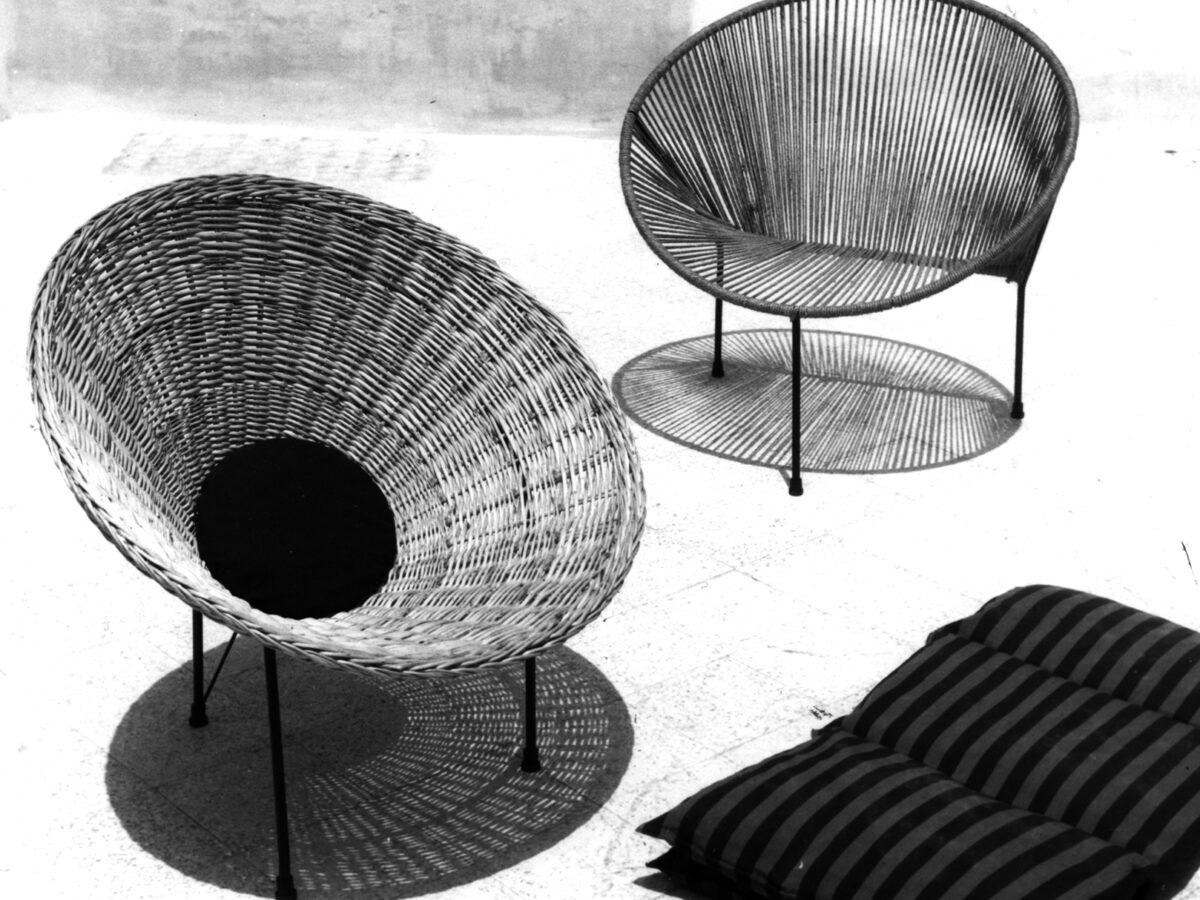 Da storia nasce storia; accanto alla vicenda della Bowl c’è quella di un’altra poltroncina ancor più essenziale, basata anch’essa su una seduta/schienale (non mobile però) sostenuta da una leggera struttura metallica. È la poltrona Girasole del vulcanico architetto partenopeo Roberto Mango che fissò un cono di vimini (l’idea e il materiale li aveva presi dalle tradizionali nasse da pesca) su un telaio di tondino metallico. Ecco tutto. Ideata da Mango che nei primi anni Cinquanta, dopo un soggiorno americano, era tornato a Napoli, la poltroncina che ormai era nota come Sunflower ebbe un successo straordinario nonché imitazioni a non finire. Oggi è rieditata fedelmente da Pezzi di Napoli.