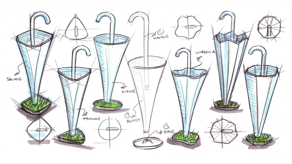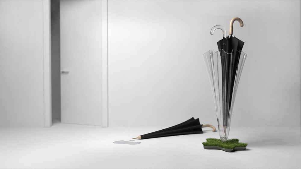 Ella Umbrella Stand, by Simon Enever, è un portaombrelli in materiale acrilico trasparente che sfrutta l’acqua piovana grondante dagli ombrelli per coltivare un piccolo prato casalingo.