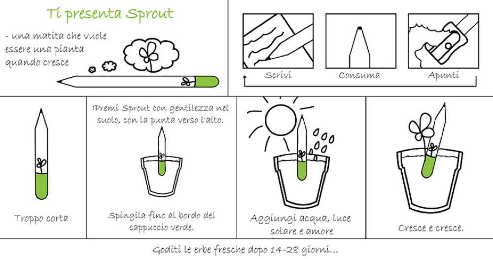 Sprout è una matita che, quando diventa un moncherino può essere piantata e si trasforma in erba aromatica. Realizzata in legno di cedro, grafite e argilla è 100% naturale e contiene una capsula con semi biologici di basilico, coriandolo, aneto, menta, rosmarino, salvia o timo. Nel 2013 è stato nominato miglior prodotto eco-friendly dell’anno dalla Global Procurement Promotional Organization – IGC.