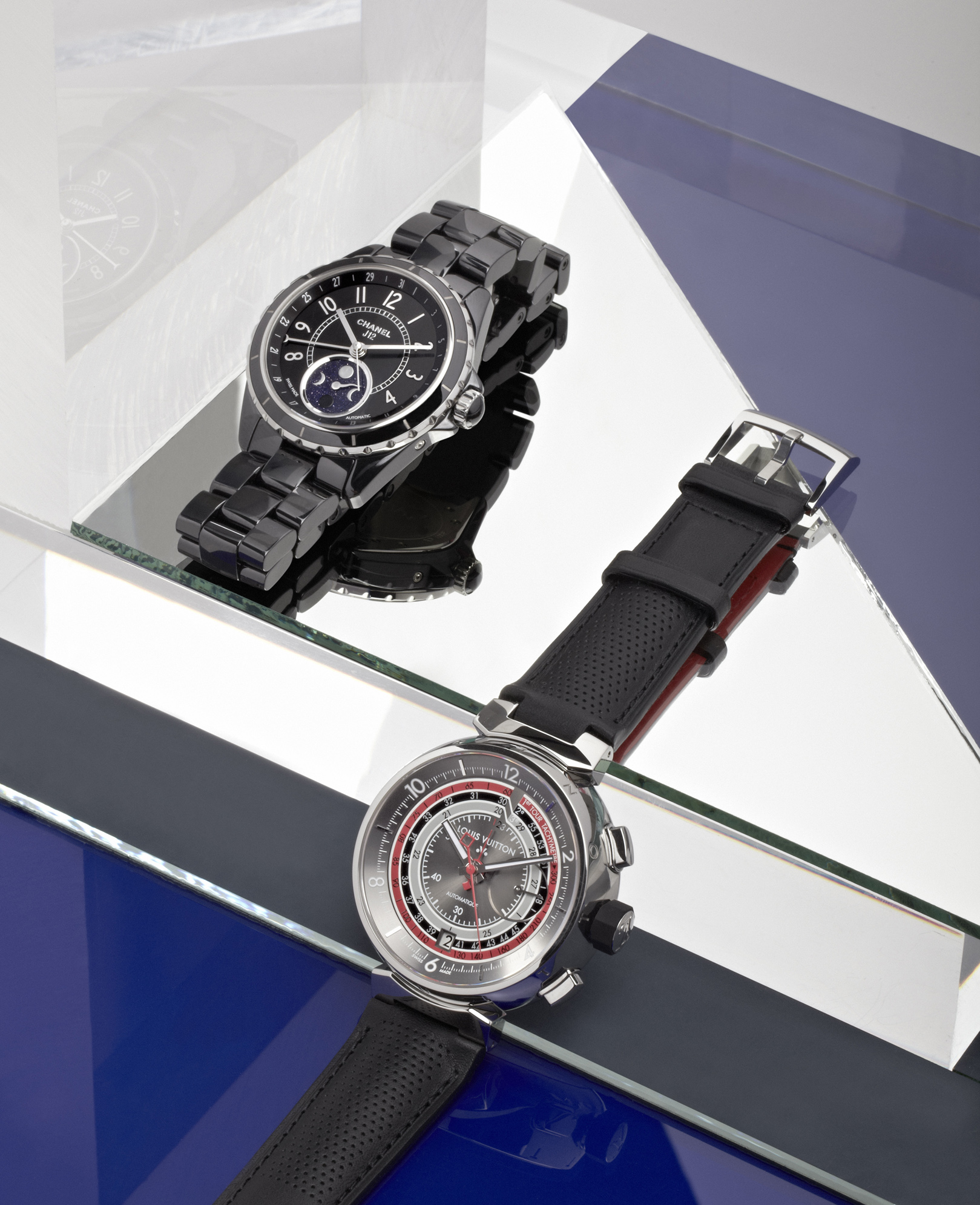 In alto, il J12 Moonphase di Chanel (6.900 euro), in ceramica hi-tech, riporta le fasi di luna a lancetta in un cielo di avventurina. Subito sotto, il cronografo automatico Tambour Voyager II di Louis Vuitton (6.100 euro), in 888 esemplari, che calcola la velocità su una tripla scala tachimetrica