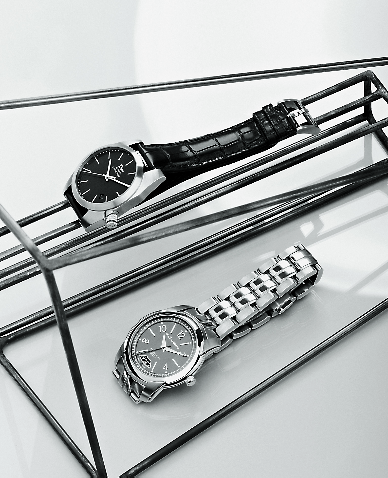 Sopra, in alto, la grafica essenziale dello Chiffre Rouge A03 di Dior (2.600 euro), automatico con cassa di 36 mm di diametro e cinturino in alligatore. In basso, interamente in acciaio, il nuovo DG7+ di Dolce&Gabbana (2.950 euro) ospita un calibro automatico con indice triangolare per il datario.