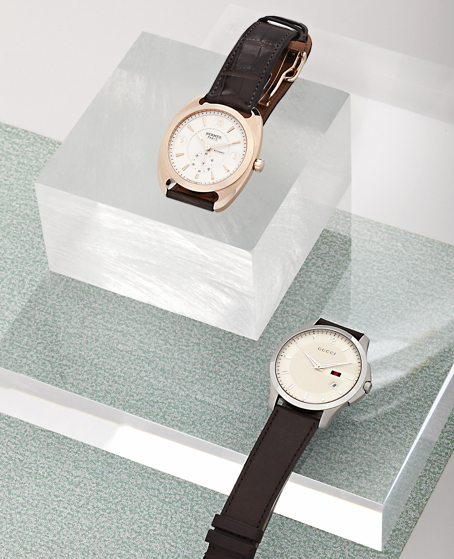 A sinistra, cassa tonneau in oro rosa e movimento automatico, di manifattura, per il Dressage di Hermès (23.100 euro). A destra, cassa slim in acciaio e movimento al quarzo Swiss made per il G-Timeless di Gucci (680 euro), con décor diamante e Web, il motivo verde e rosso tipico del brand.