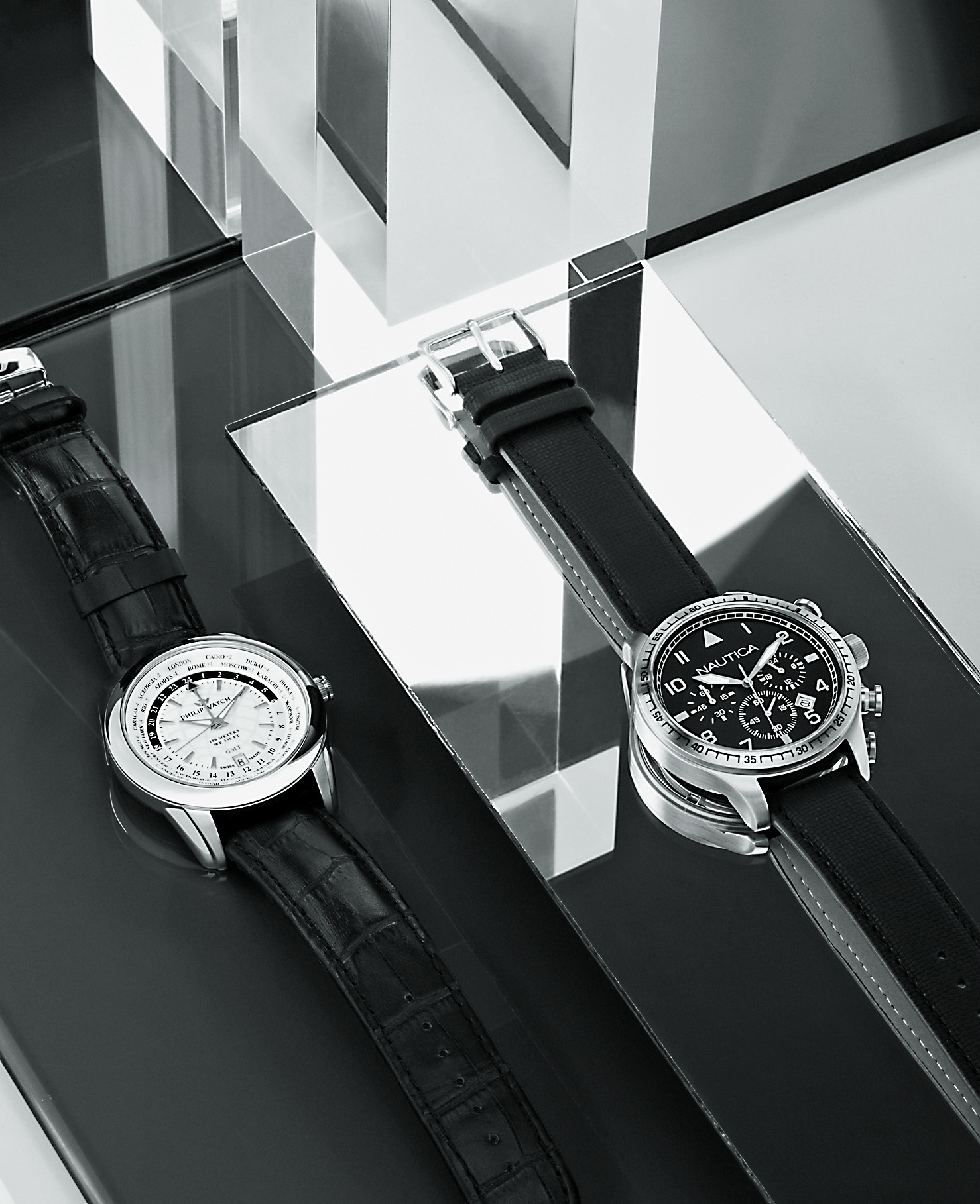 Sopra, a sinistra, mostra l’indicazione di 24 fusi orari il Seahorse di Philip Watch (540 euro), con cassa in acciaio, movimento al quarzo e quadrante smaltato. A destra, il cronografo al quarzo BFD 105 di Nautica Watches (179 euro), con cassa XL impermeabile fino a 10 bar