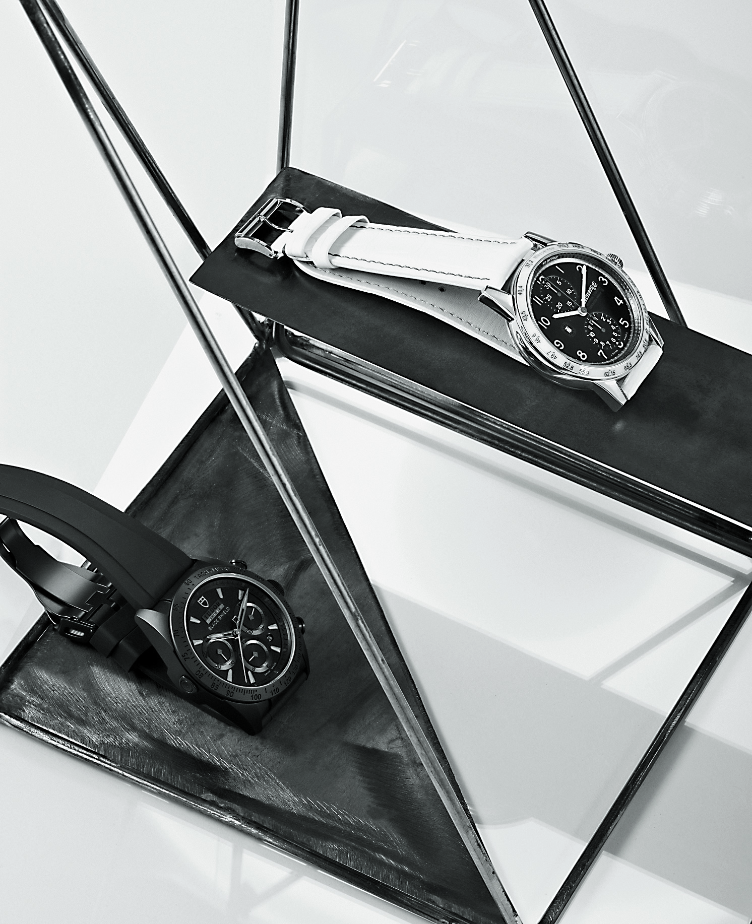 In basso a sinistra, ha la cassa monoblocco in ceramica hi-tech il cronografo automatico Fastrider Black Shield di Tudor (3.930 euro). In alto a destra, il Tazio Nuvolari Grand Prix Edition Limitée di Eberhard & Co (3.150 euro), in 999 esemplari, dedicato all’omonima gara d’auto d’epoca.