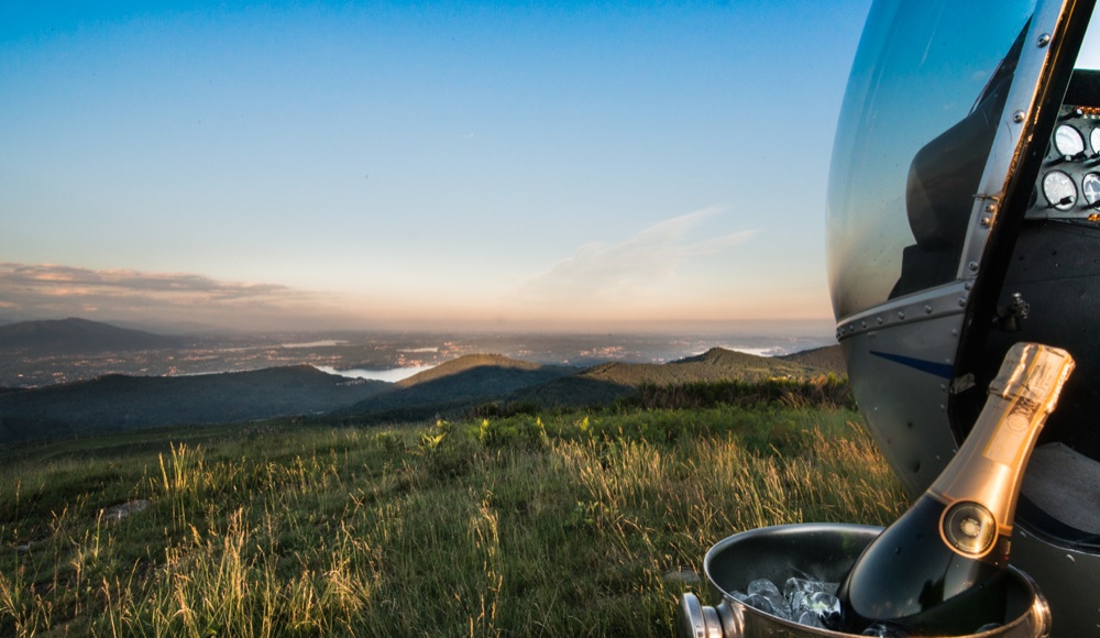 Lo scenario è quello del Lago Maggiore e del Lago d’Aorta. Si decolla da Milano e dintorni si sorvolano il laghi sfiorando i giardini botanici del Palazzo Borromeo dell’Isola Bella fino all’Isola dei Pescatori. Poi sul Lago d’Orta luogo magico, decantato da artisti e scrittori, con a sua Isola di San Giulio sede di leggende di lotte con draghi e serpenti fino alla Basilica, l’unica costruzione dell’isola. E, infine, si raggiunge quota 1.600 metri, sulla cima del Mottarone dove, di fronte a una vista a trecentosessanta gradi che spazia dalle Alpi Marittime al Monte Rosa passando per la Pianura Padana, si brinda con una flute di Champagne e si scatta il miglior selfie di sempre.