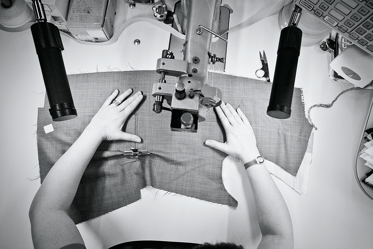 Dopo il taglio, i pezzi vengono riuniti in mucchietti e, seguendo un iter rigoroso, inizia il processo di confezione. Ricco di scelte ben ponderate, come quella di non “adesivare” tessuto e interno, ma di cucirli l’uno con l’altro, così la giacca, più elastica, si adatta meglio ai movimenti di chi la indossa. In queste fasi l’automazione è molto ridotta, se non del tutto assente: «Nel complesso, in tutto il processo», sottolinea Corrado Corneliani, «il rapporto è 70% ago e 30% computer».