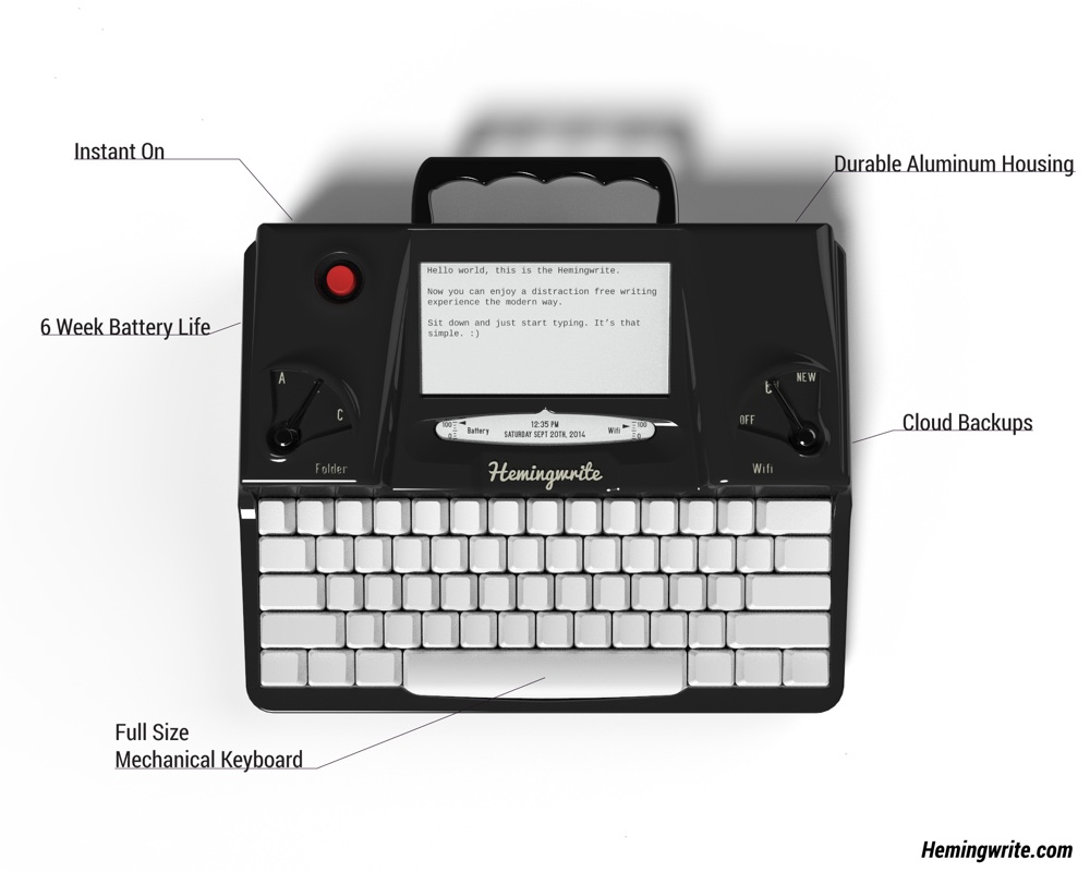 Hemingwrite – È la macchina da scrivere del futuro. O il computer portatile venuto dal passato. Ispirata nel design alle macchine da scrivere anni 80, Hemingwrite ha una tastiera da computer e un display come quello dei lettori di e-book. Ha una batteria autonoma per sei settimane e una connessione wi-fi integrata per salvare il lavoro in rete, ma non offre la possibilità di navigare sul web. L’ambiente di scrittura, così, resta rigorosamente chiuso, favorendo la concentrazione. In fase di prototipo, è disponibile in tre colori: bianca, rossa e nera.