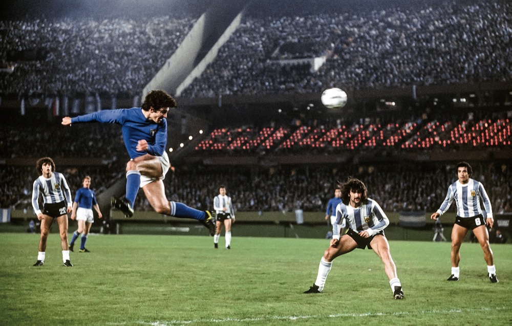 Lo spettacolare colpo di testa dell’attaccante Paolo Rossi durante la partita con l’Argentina vinta 1-0 durante la Coppa del Mondo del 1978. (Roger Parker/Fotosports International)