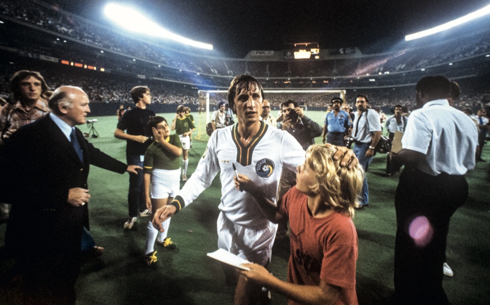 Johan Cruyff, con la maglia dei New York Cosmos, firma autografi: ex giocatore e dirigente olandese, è considerato uno dei calciatori migliori del mondo e interprete assoluto del “calcio totale” che rese grande l’Ajax negli anni Settanta. (1978, Peter Robinson/Press Association)