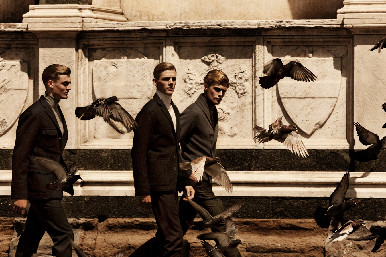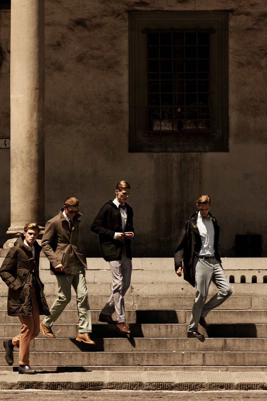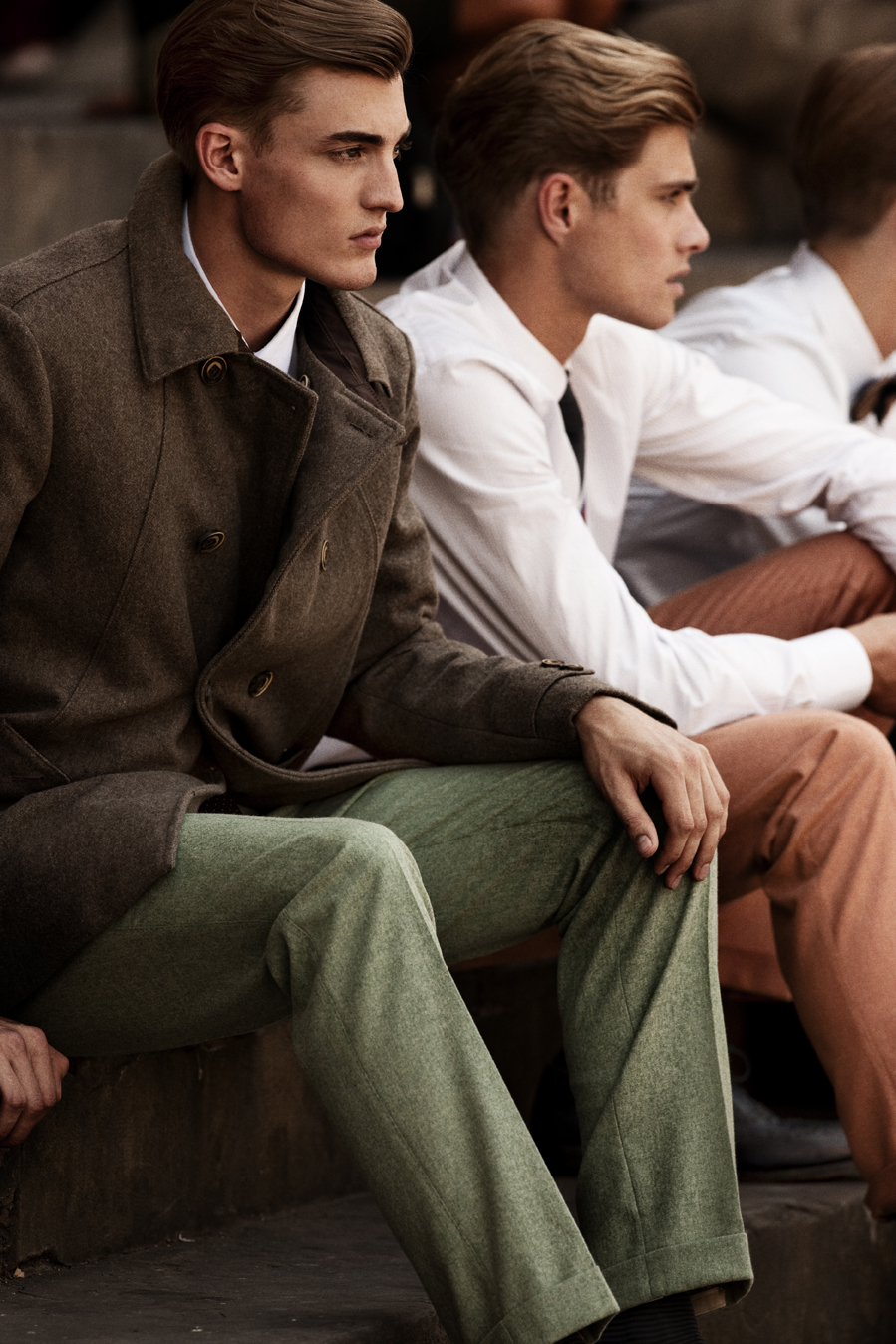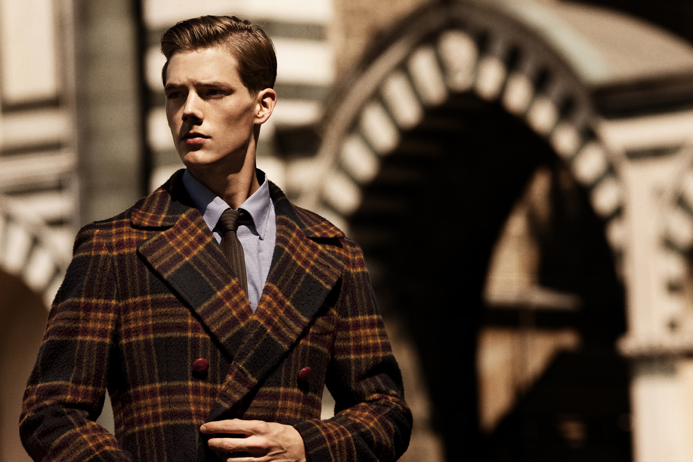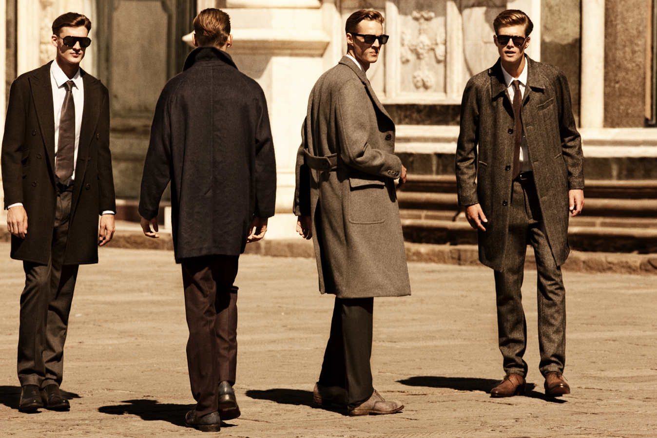 Da sinistra, cappotto e pantaloni Boglioli, camicia Bagutta, cravatta Corneliani, scarpe Moreschi e occhiali Gucci. Di spalle, total look Kenzo. Accanto, cappotto, camicia e pantaloni Berluti, scarpe Santoni e occhiali Persol. A destra, total look Iceberg, scarpe Santoni e occhiali Ray-Ban