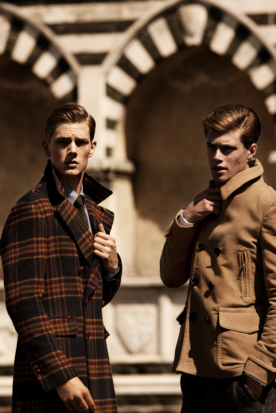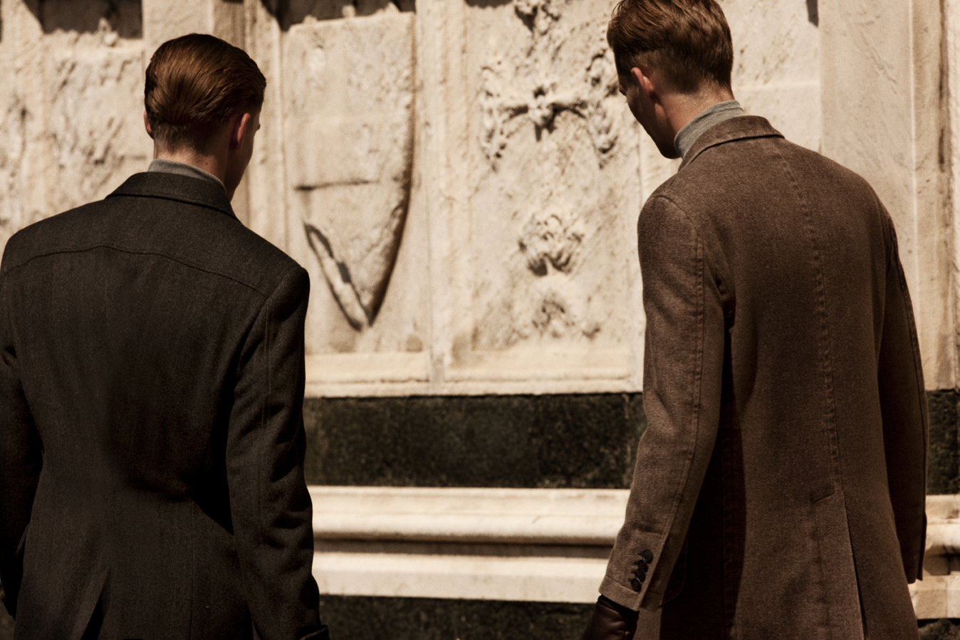 A sinistra, cappotto Tagliatore, camicia e cravatta Ermenegildo Zegna; a destra, giaccone David Mayer