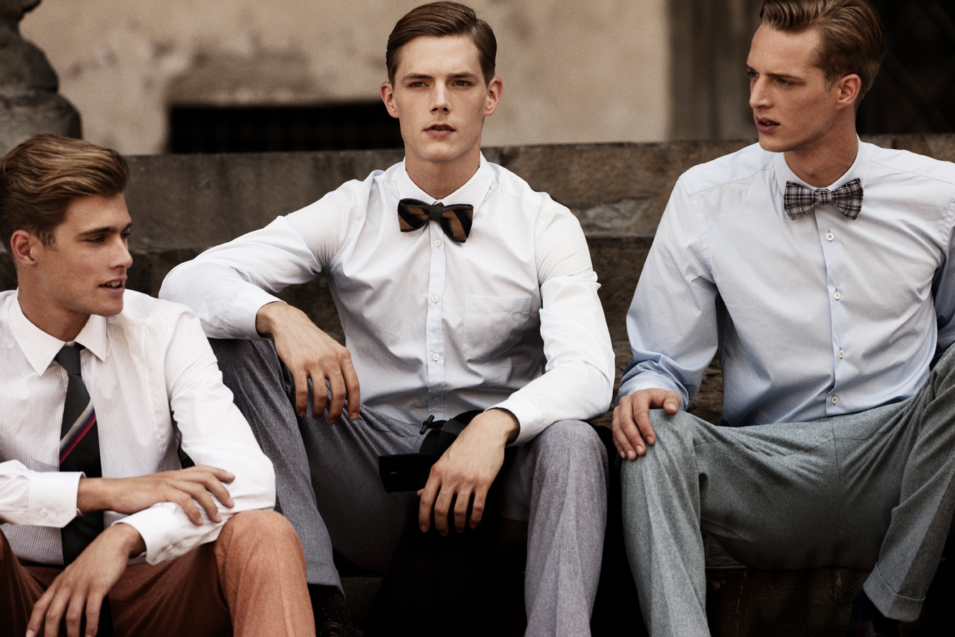 A sinistra, giacca Mash, camicia, cravatta e pantaloni Gant, scarpe Santoni; a destra, maglia Bramante, camicia e cravatta Gucci, pantaloni Boglioli, scarpe Sebago