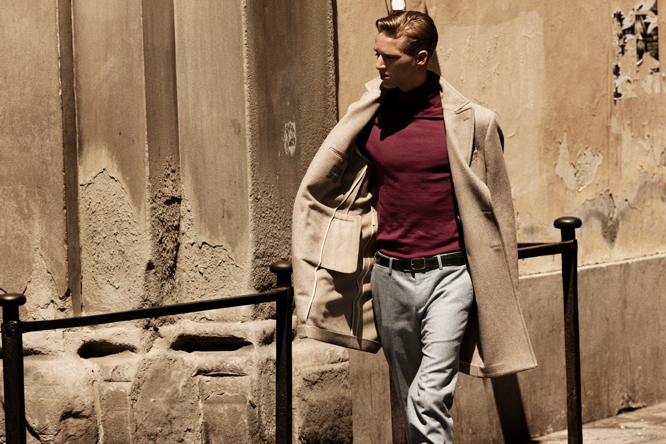 Cappotto in lana rasata Paoloni, dolcevita burgundy Ermenegildo Zegna e pantaloni Corneliani, cintura Paul Smith
