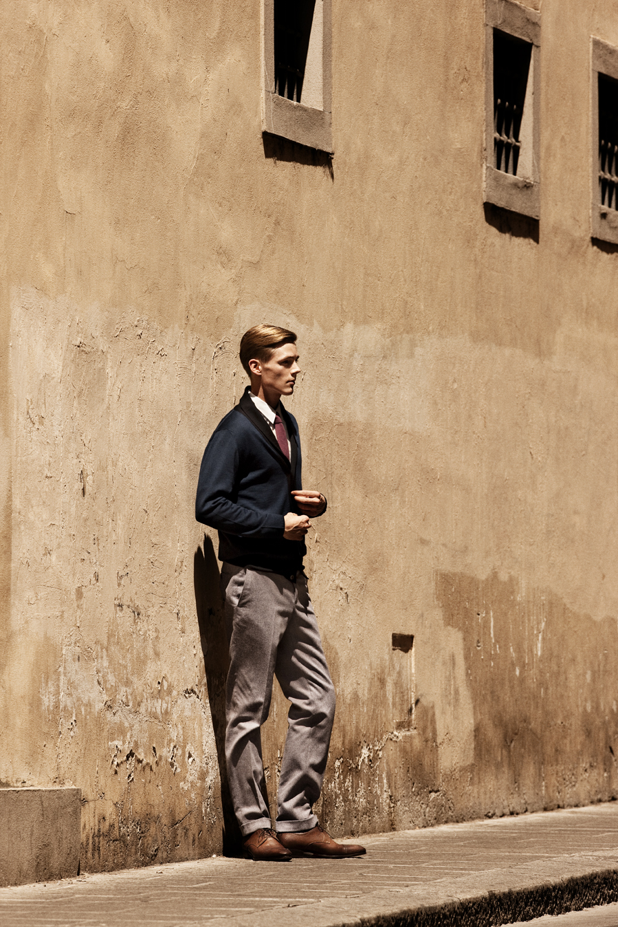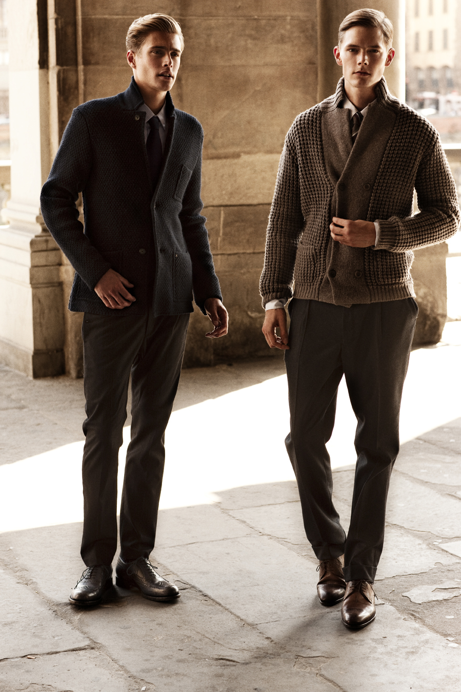 A sinistra, giacca Closed, camicia Bagutta, cravatta Corneliani, pantaloni Myths, scarpe Santoni; a destra, giacca-cardigan Della Ciana, camicia Bagutta, cravatta Gucci, pantaloni Berluti, scarpe Santoni