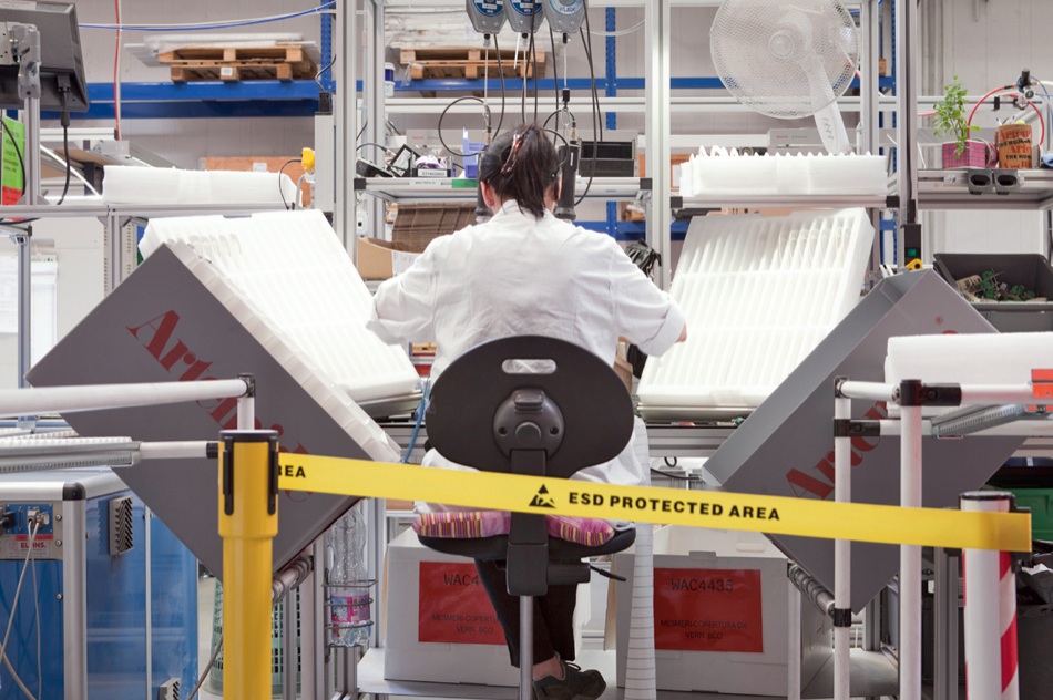 Artemide ha deciso di trasformare questa scossa tellurica in un’opportunità, nell’unica maniera sensata: aggiornandosi. Mettendosi a produrre in casa circuiti e chip senza acquistarli all’esterno, gestendo il ciclo di produzione per intero. Che inizia in una vasta officina dove dominano un’imponente macchina tedesca per il taglio al laser di ferro e alluminio e un’altra per il cesello ad acqua di pietra, vetro, plastica e di tutti quei materiali allergici al calore. La nostra guida è l’esperto Giordano, qui da 19 anni: ci scorta tra le aree dove i pezzi vengono rifiniti, piegati, saldati; nella zona della verniciatura, liquida o a polvere, in un forno a 200 gradi; in quella della lucidatura e dell’assemblaggio, dove molte postazioni sono recintate e gli addetti indossano guanti e camici per evitare che l’energia presente nel loro corpo si scarichi sui componenti elettronici, danneggiandoli. Ecco il senso delle parole di Gismondi, la prova pratica di un know-how capace di mescolare creatività, tecnologia e un pizzico di vera e propria scienza.