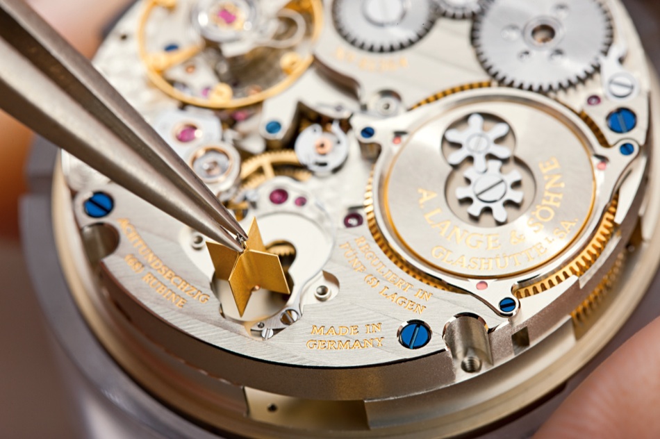 BUONA LA PRIMA – A questo punto, si smontano tutti pezzi: è arrivato il momento d’indossare l’abito da sera e, in un ambiente climatizzato e privo di particelle di polvere, ogni particolare viene nuovamente pulito, lucidato e decorato a mano. All’ultima fase della lavorazione, le viti usate per l’“imbastitura” vengono sostituite da altre azzurrate alla fiamma; mentre i rubini, ovvero i cuscinetti antiattrito, vengono fissati con minuscoli anelli d’oro (i cosiddetti castoni) e viti. Montati quadrante in argento massiccio e lancette, in oro o azzurrate, il movimento è sottoposto a un nuovo controllo della precisione di marcia e incastonato in una cassa d’oro o di platino. L’orologio è pronto. E sul suo quadrante, accanto alla firma dell’azienda, spicca ora anche la dicitura “Made in Germany”: nazionalizzata dal governo della Germania Est dopo la Seconda guerra mondiale, la A. Lange & Söhne è tornata, dopo la caduta del muro di Berlino, all’antico splendore. Oggi grazie al lavoro di 600 persone produce circa 5.000 orologi d’altissima gamma.