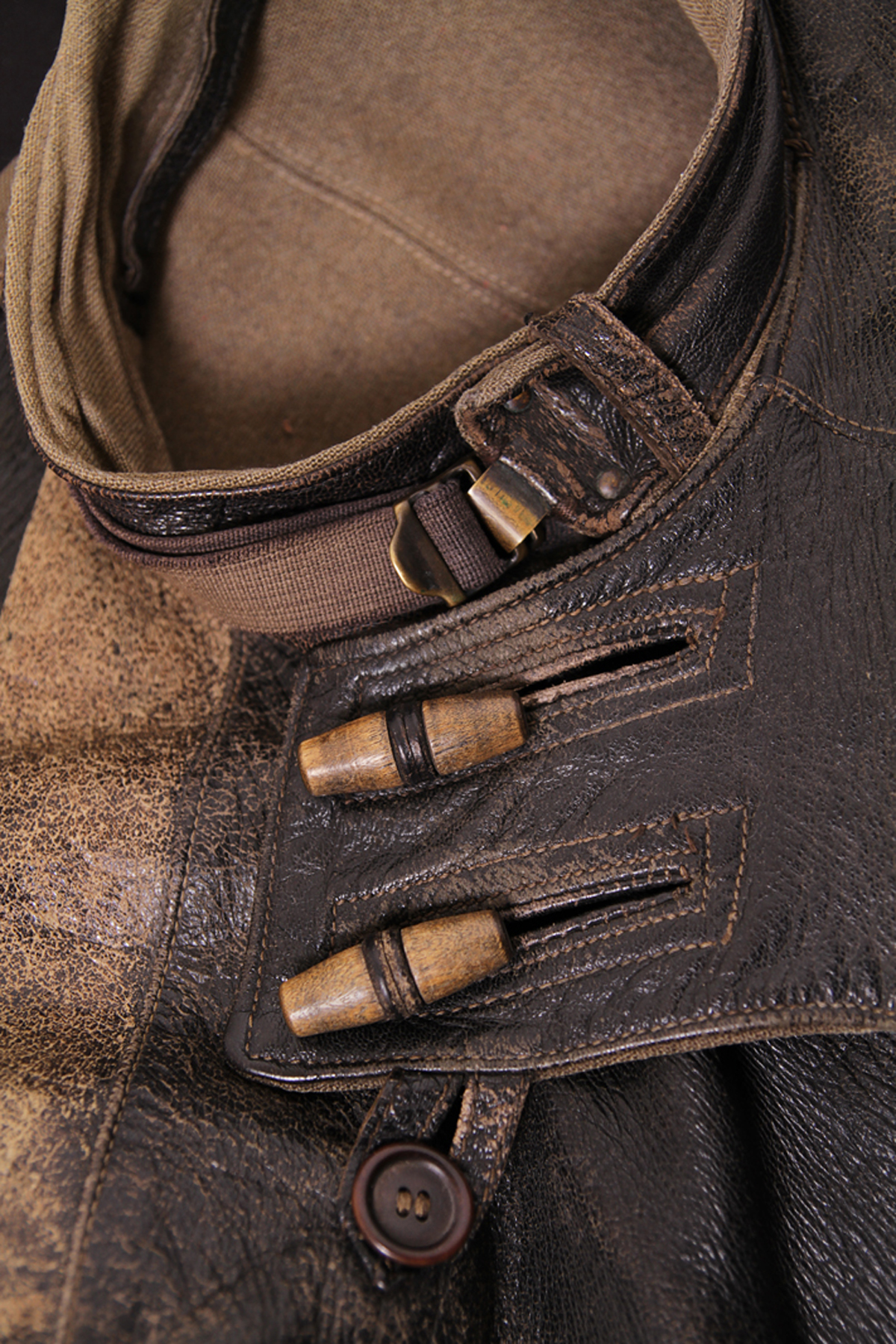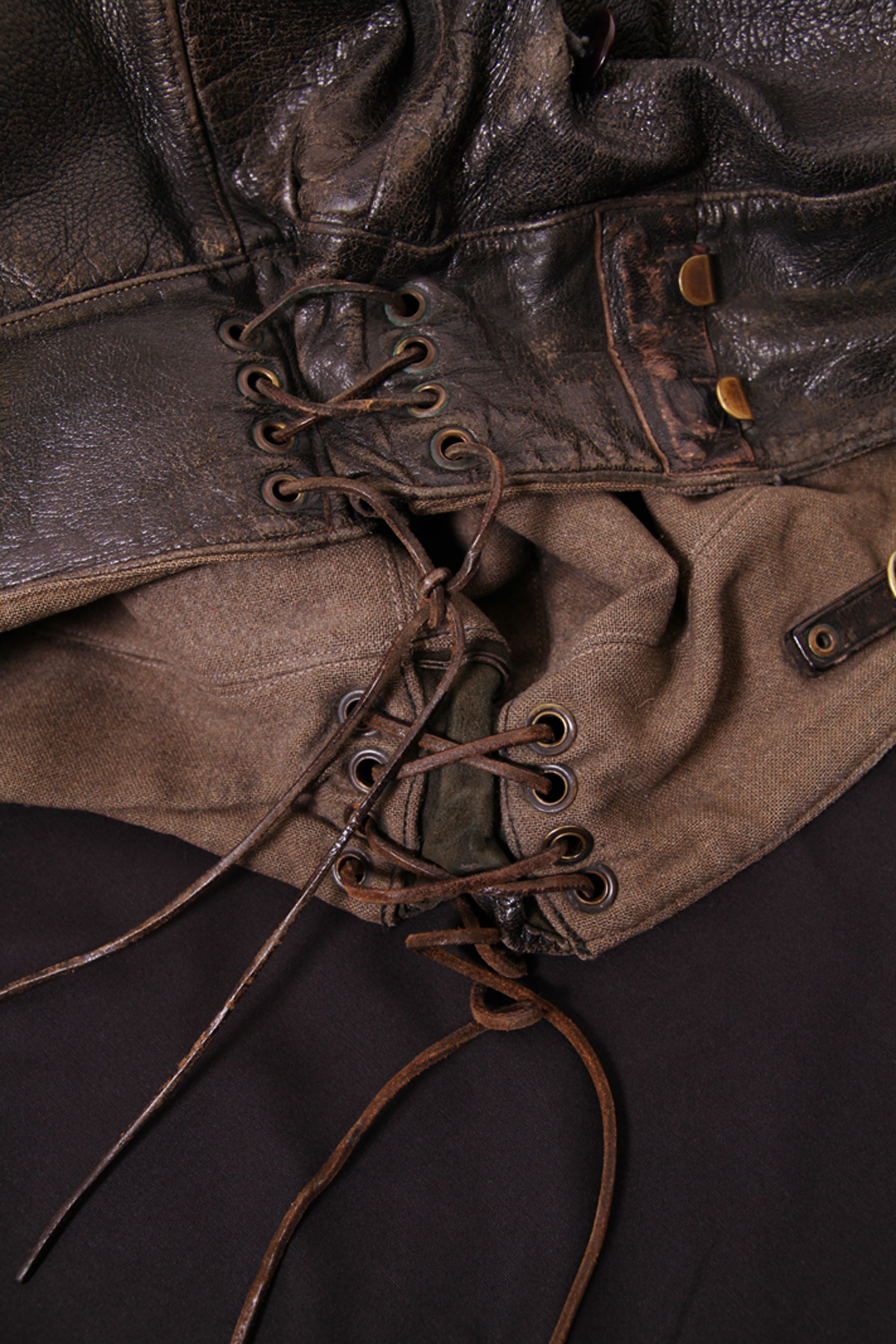 Giacca da motociclista portaordini dell’esercito svedese (anni 30). La larga patta è regolabile lateralmente tramite lacci di pelle che assicurano maggiore aderenza al corpo