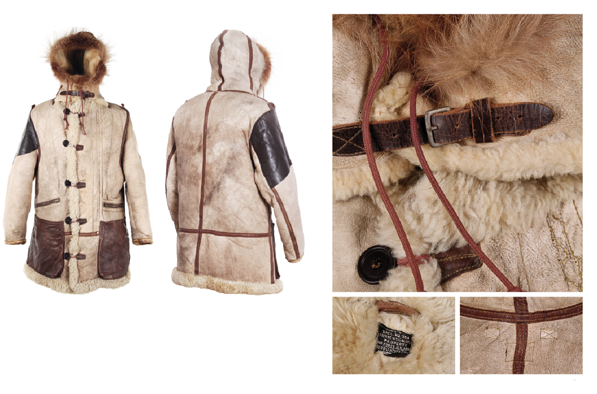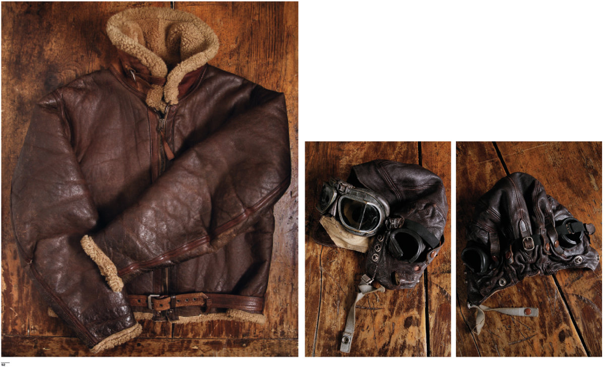 La giacca Irvin (anni 40) è il simbolo dei piloti dei caccia della Raf nella Seconda Guerra Mondiale. La cuffia Tye -C scamosciata sul davanti ha la linguetta degli gli occhialoni fissata alla cuffia da linguette di pelle e assicurata sulla nuca da una fibbia