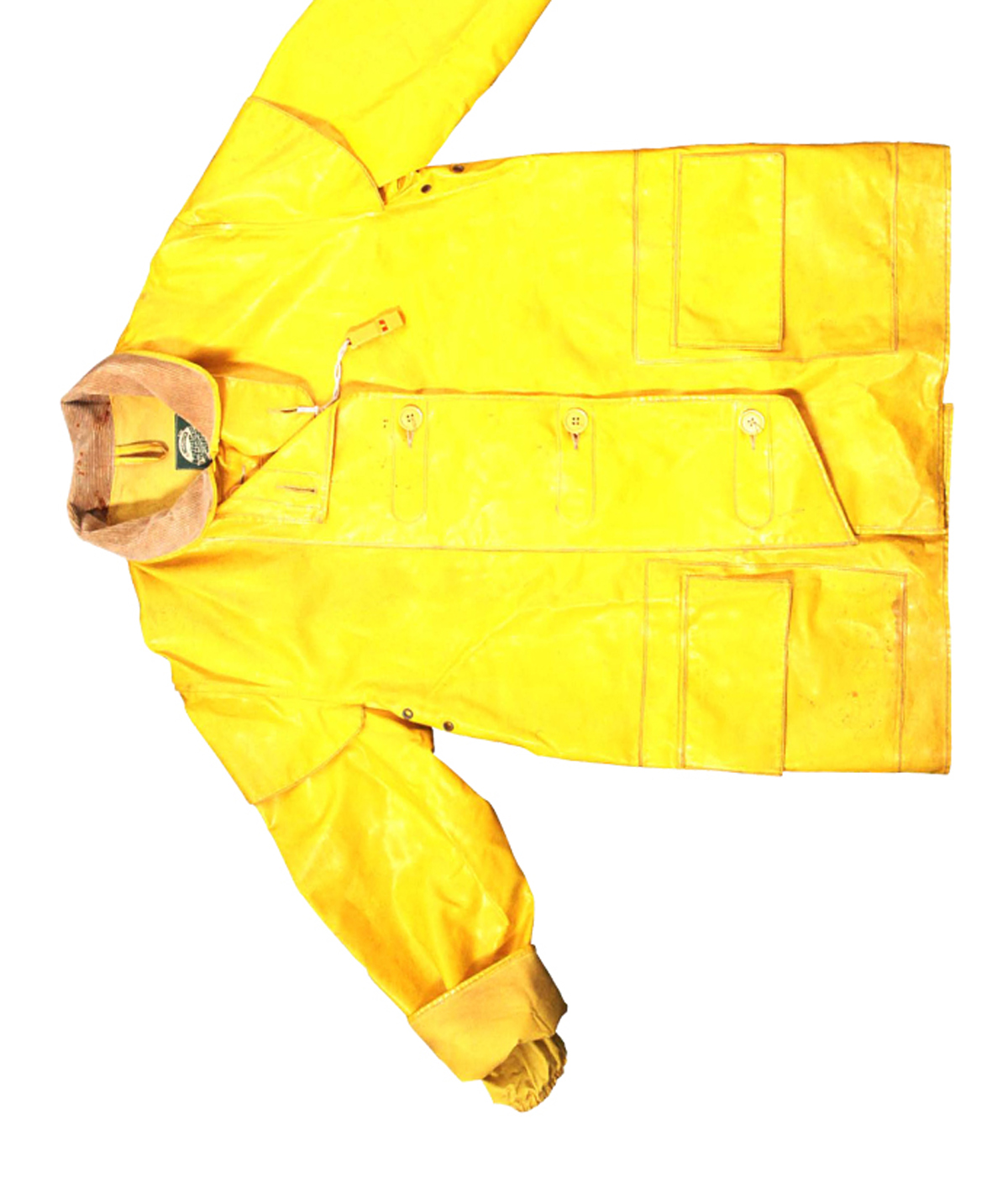 Cerata da vela Yarmouth (anni 60) in cotone gommato con il bavero foderato di velluto a coste. Fischietto appeso al colletto in caso di caduta fuoribordo