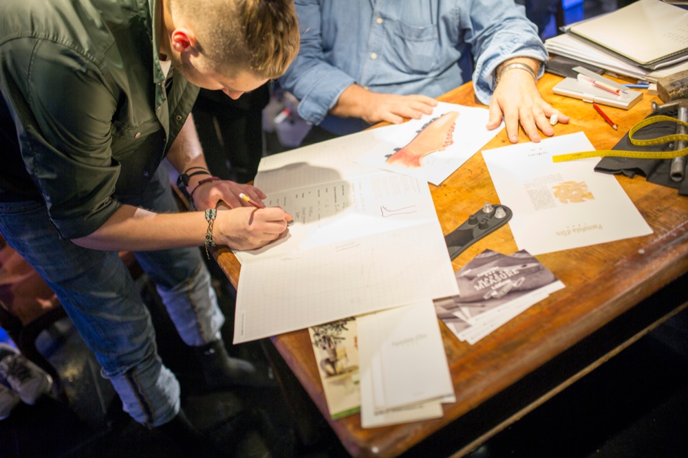 Sulle pareti del piano superiore da una parte ci sono gli utmimi modelli di scarpe esposte come opere d’arte, protette da teche di vetro e illuminate da neon che cambiano colore, dall’altra la history wall di Pantofola d’Oro, un progetto permanente che ripercorre tutte le tappe di ormai centotrent’anni di artigianato del calzaturificio italiano. Al piano inferiore invece i modelli virtuali, su cui tra poco sarà possibile proiettare il proprio volto, e un mega schermo collegata a una Play Station dove vengono organizzate sfide calcistiche.