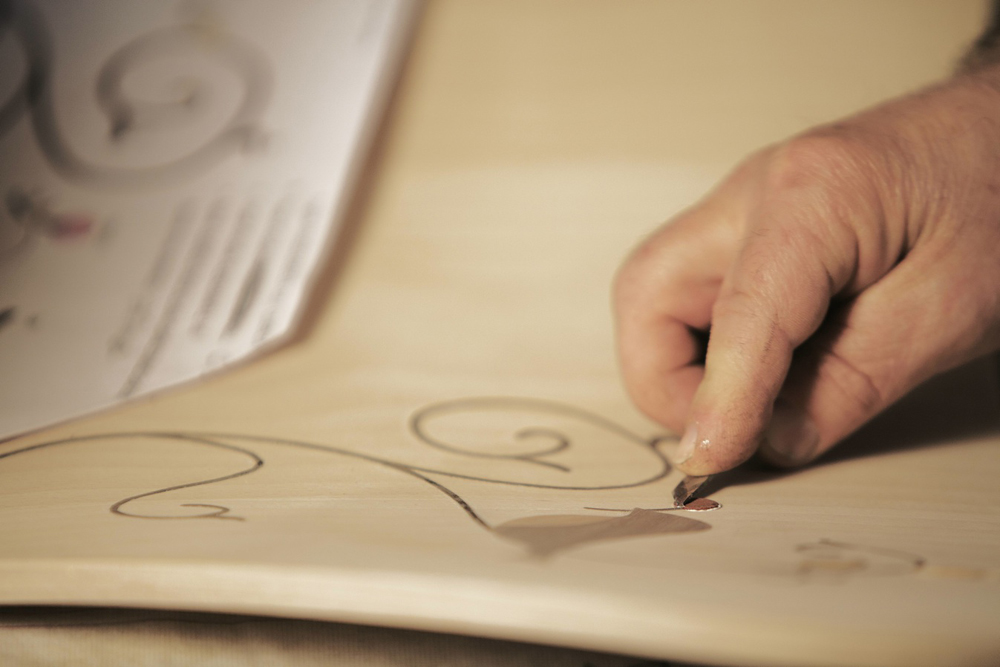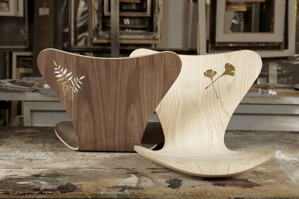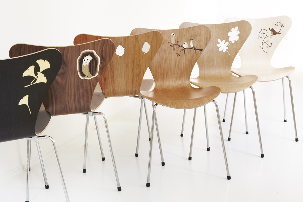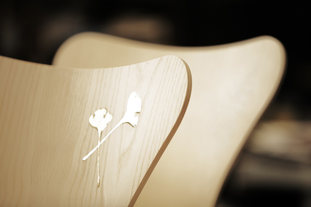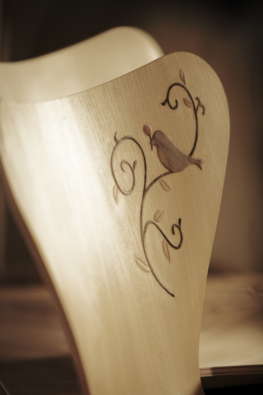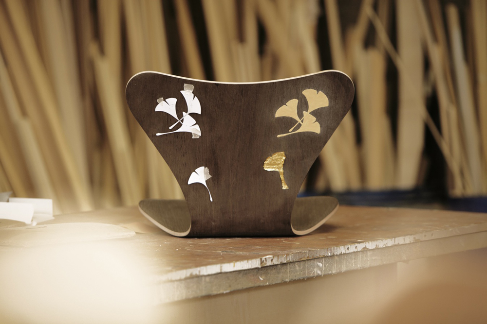 Le 12 sedie sono state rielaborate secondo antiche tecniche di doratura e intarsio con il raffinato gusto nipponico e realizzate da due abili artigiani della Confartigianato di Lodi nelle finiture acero, faggio, frassino, olmo, rovere, ciliegio, noce e rovere tinto scuro.