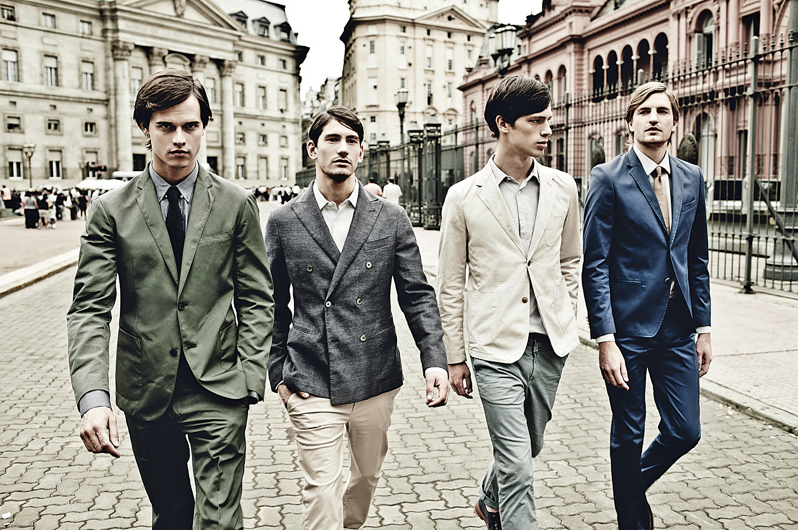 Da sinistra. Abito, camicia e cravatta Calvin Klein. Giacca doppiopetto, camicia e chinos, tutto Siviglia. Giacca a due bottoni, camicia e pantalone, tutto Closed. Abito Frankie Morello, camicia Aglini, cravatta Prada. A destra sullo sfondo, la Casa Rosada, sede del potere esecutivo dell’Argentina.