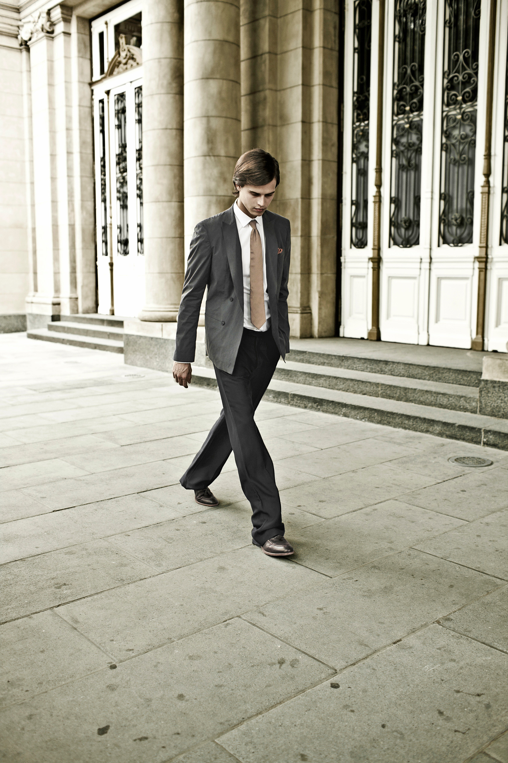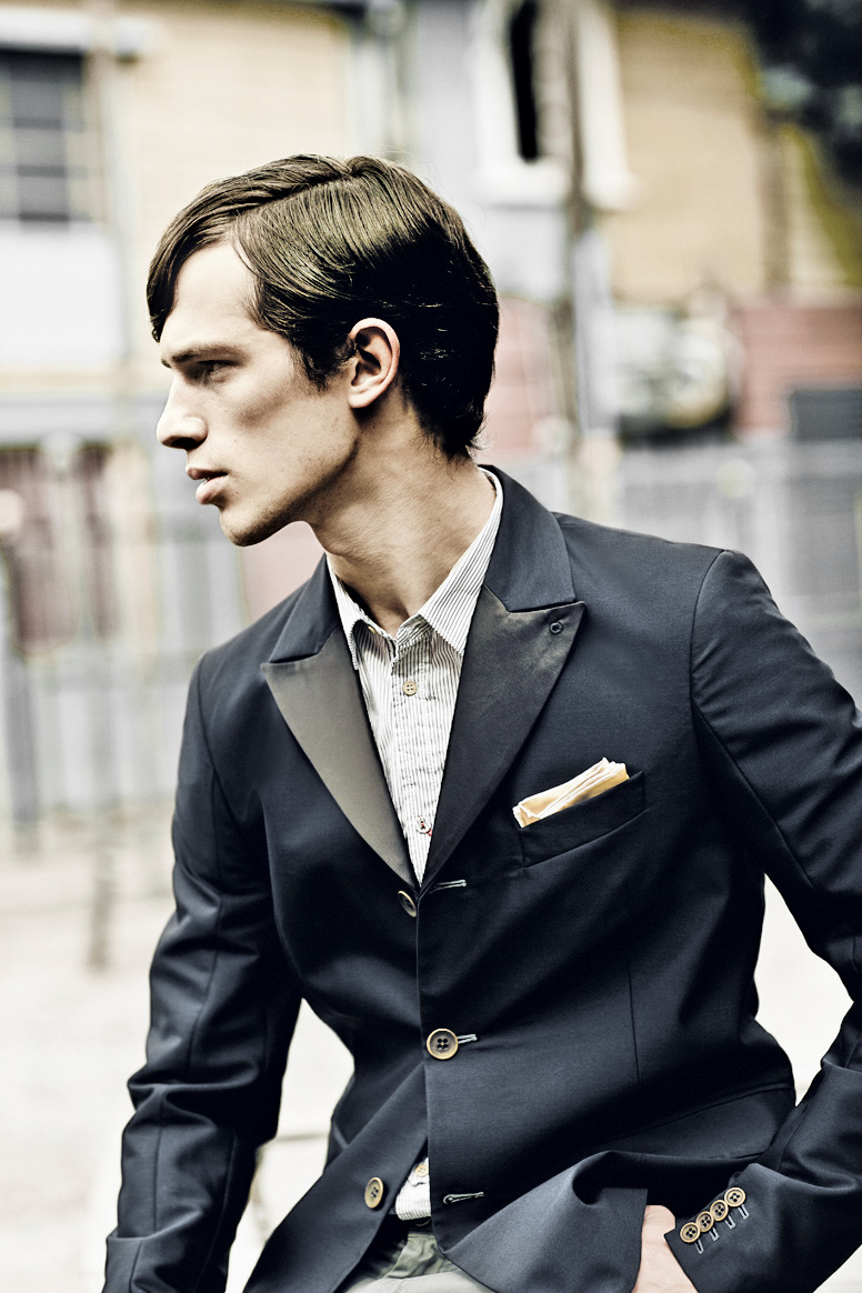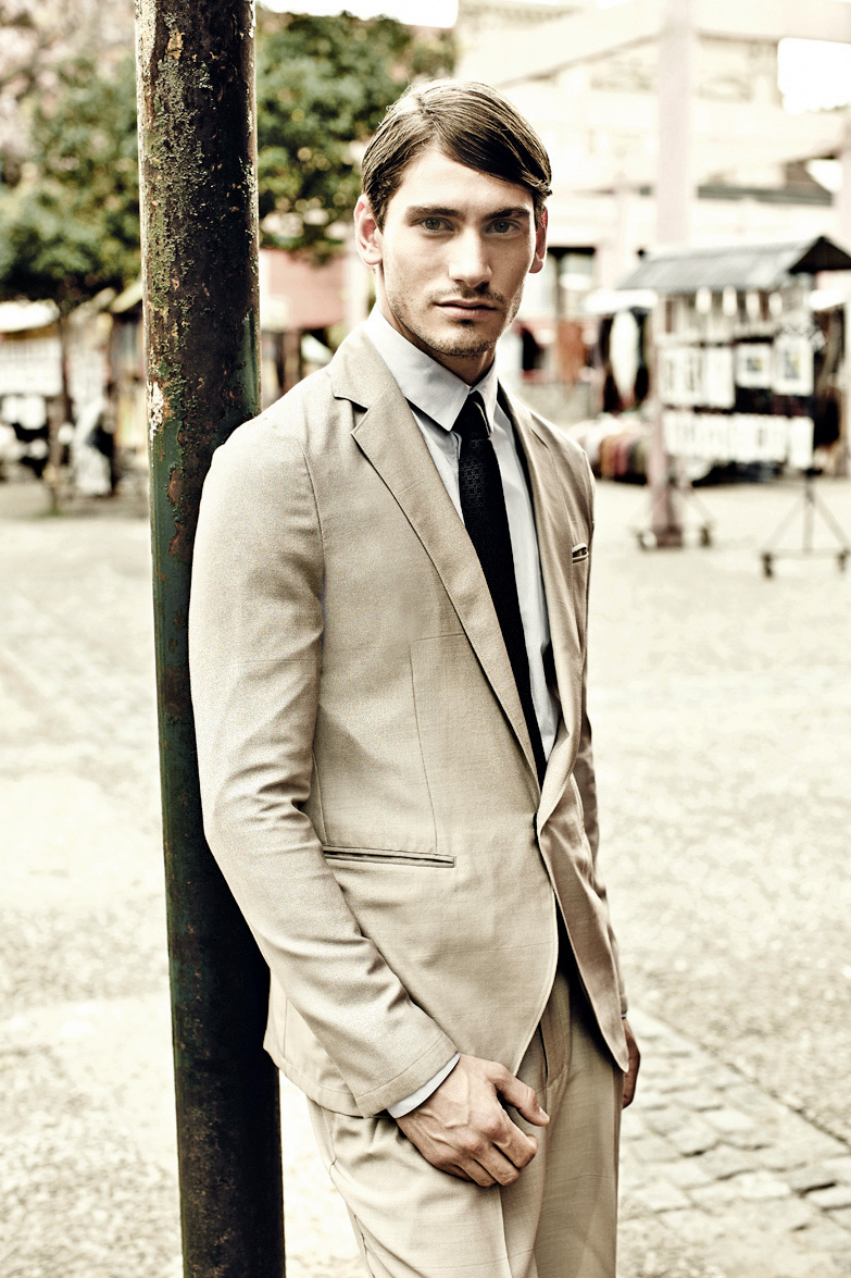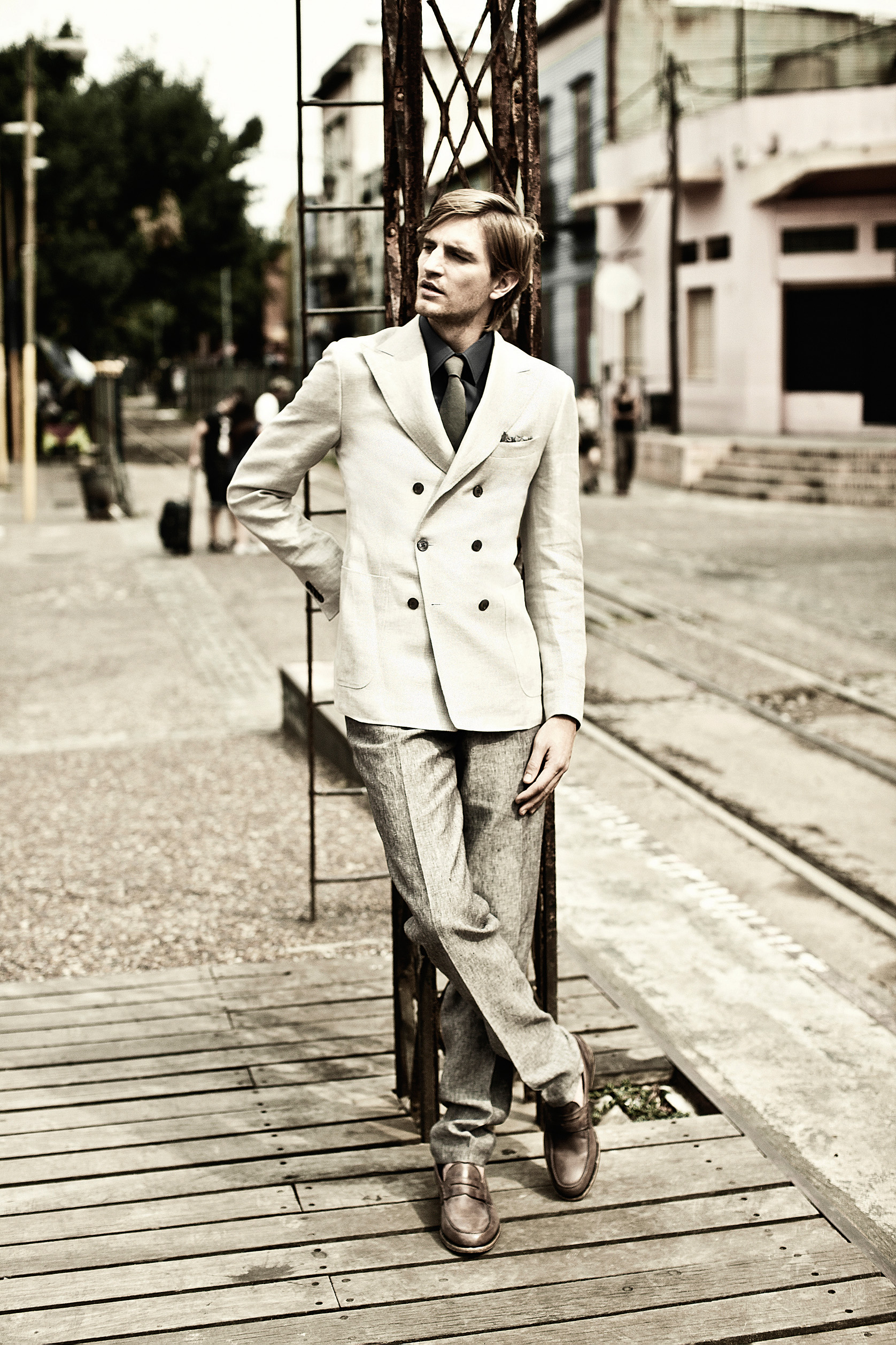 Giacca, pantaloni e pochette Canali, camicia G-Star, cravatta Calvin Klein, scarpe Santoni. Sullo sfondo, il “Caminito”, strada-simbolo del quartiere La Boca, lunga solo 100 metri. Al centro si vedono ancora le rotaie della vecchia ferrovia, che ha smesso di funzionare nel 1920.