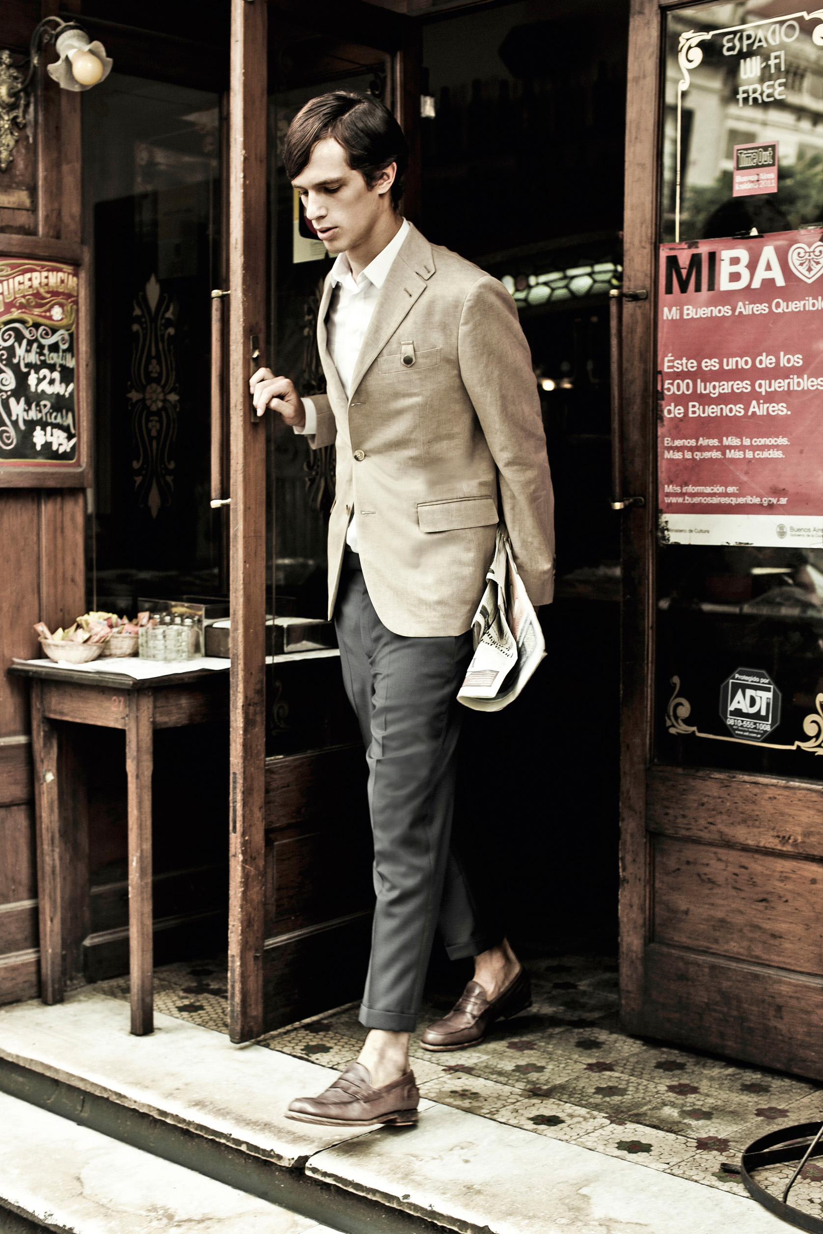Giacca Fay, camicia e pantaloni Dior Homme, mocassini in pelle spazzolata Santoni. Il modello sta uscendo da uno dei bar più antichi di Buenos Aires, El Federal, inaugurato nel 1864 in via Carlos Calvo, nel cuore del quartiere di San Telmo.