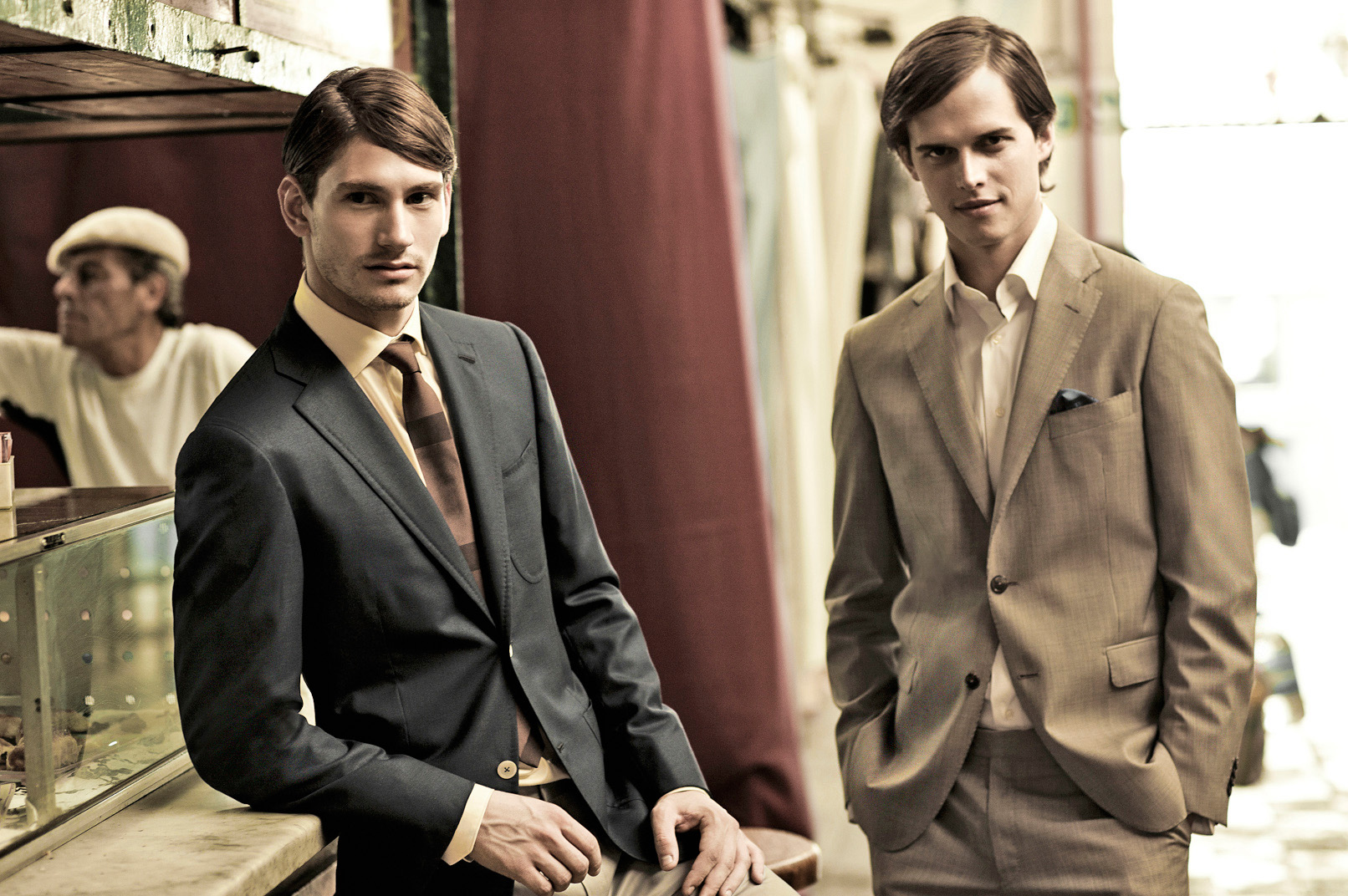 A sinistra, giacca e pantaloni Isaia, camicia Italia Independent, cravatta Gucci. A destra, total look Boggi. Sullo sfondo il Mercado de Sant’Elmo, uno dei più antichi e meglio conservati della città, con strade di ciottoli e case coloniali. Vi si trovano numerosi negozi di antiquariato.