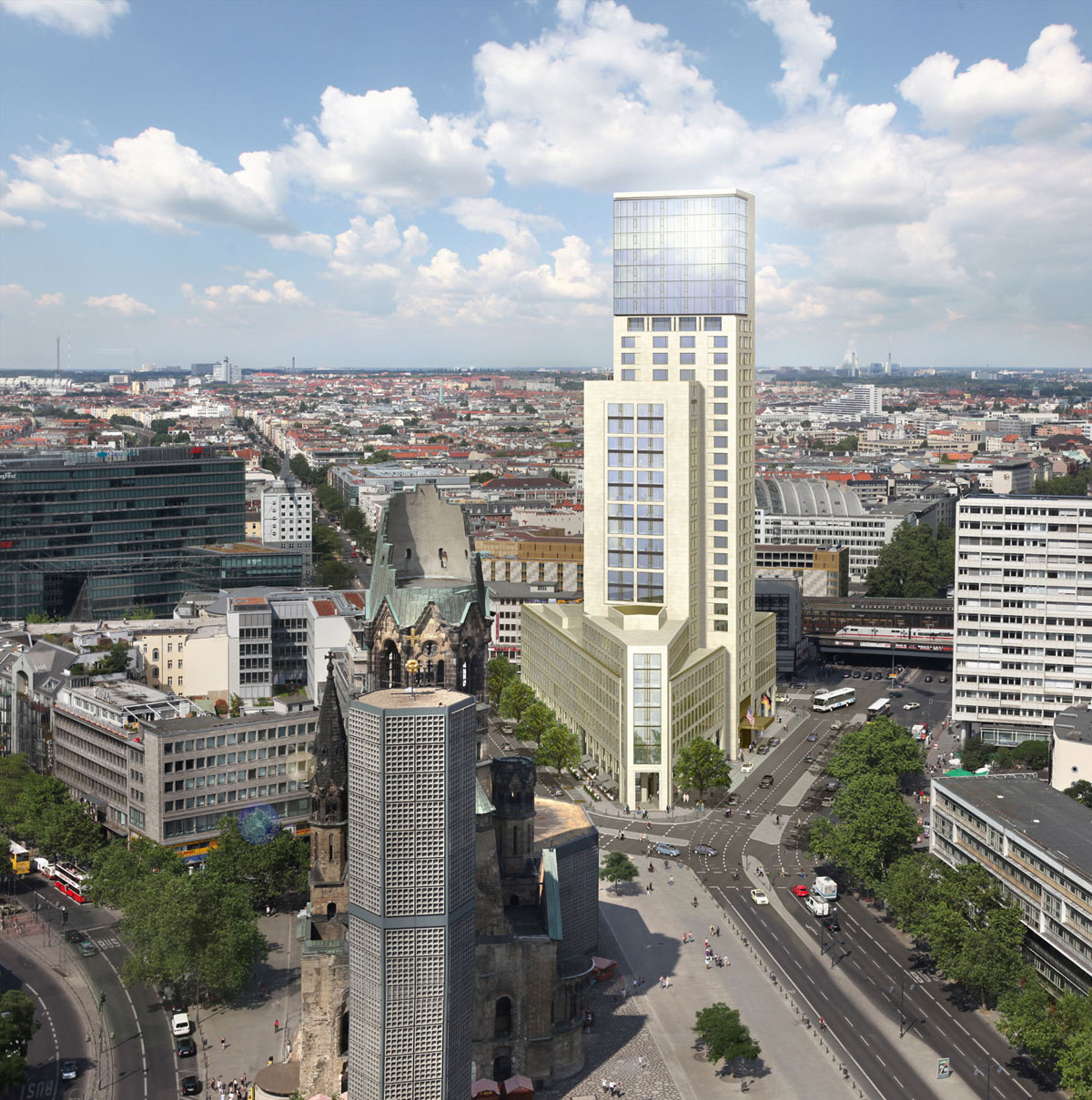 Tutto l’albergo si ispira ad un gusto liberty che reinterpreta il primo Novecento. 32 piani per 118 metri di altezza, 232 camere, l’hotel include una libreria per soli ospiti con divani e volumi selezionati, un ristorante affidato al cuoco francese Pierre Gagnaire, una spa Guerlain, il Lang Bar, che prende il nome dal regista Fritz Lang e sottolinea ancora una volta il legame con la città, e una caffetteria chiamata Romanisches Café, in onore del leggendario bar che un secolo fa sorgeva poco lontano ed era luogo di ritrovo di letterati, artisti e musicisti.