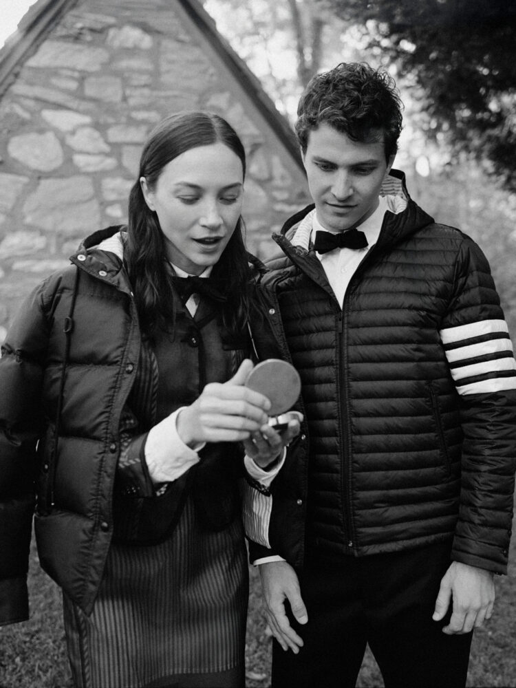 Thom Browne ambienta la campagna High Winter 2025 nella Hudson Valley, tra capispalla tecnici pensati per essere versatili e classici da sera. Giochi da prato e champagne riempiono l’aria, mentre gli ospiti si riuniscono indossando i capi essenziali della collezione autunno 2025. Abiti in velluto a coste e gessati di lana si immergono nell’acqua, accompagnati da stivali da pesca o una mela in mano. Invece, i quadretti vichy si fondono con il paesaggio autunnale, le oche applicate si confondono perfettamente su gonne a pieghe a quadri, l’emblema a 4-bar attraversa bomber varsity in pelle e pullover con zip in lana.