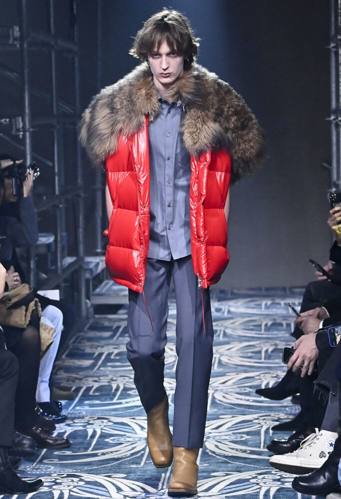 Un must tra i capispalla da uomo per l’autunno 2025 è, senza ombra di dubbio, il piumino smanicato. Prada lo tinge di rosso, lo lucida, e lo arricchisce aggiungendo un collo di ecopelliccia per rendere di tendenza un indumento solitamente associato a tutto il contrario. È perfetto per le mezze stagioni perché consente di indossare maglioni e cardigan senza sudare, anche nelle zone più “pericolose”.