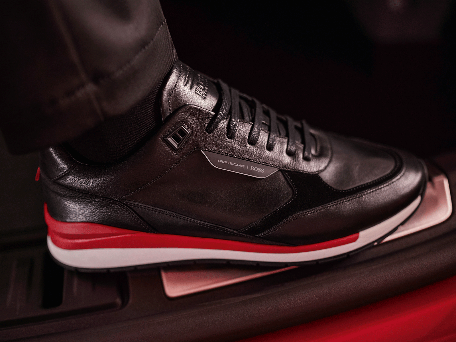 Ogni capo racconta un uomo sicuro di sé e delle sue possibilità. Anche le sneakers in pelli miste con logo esclusivo completano il mood di chi indossa Boss per Porsche: un uomo determinato a correre e a vincere.