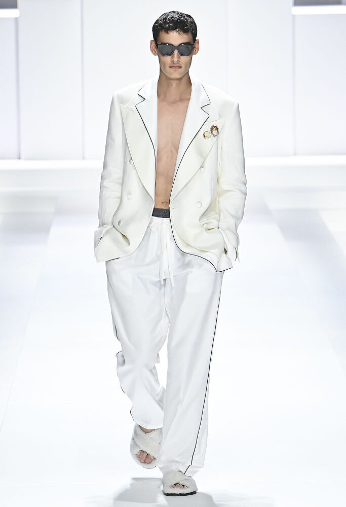 Sempre di rilassatezza e comodità parla Dolce&Gabbana, a tinte Cloud Dance. Tuttavia, cambia il design degli abiti – in questo caso più classicheggiante – e l’attitudine totalmente comfy, fino alle scarpe furry. Mentre i dettagli, come spille, boxer e ricami, restano protagonisti nonostante altre tonalità diverse dal bianco non siano contemplate in alcun modo.