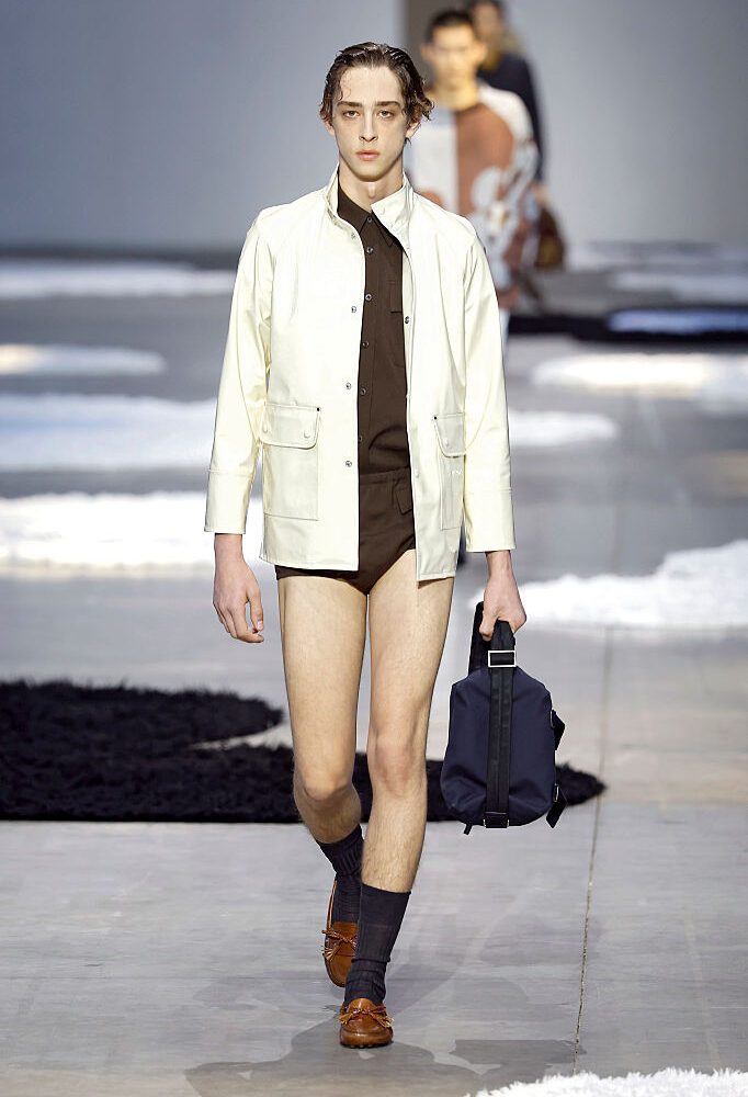 Da Prada, Miuccia e Raf Simons parlano un linguaggio astratto e al contempo lineare. I due direttori creativi procedono indubbiamente per sottrazione, ma aggiungono elementi negli outfit per amplificarne – a piccole dosi – il fascino. Com’è avvenuto con la giacca tecnica color Cloud Dance, in contrasto con il marrone e il blu notte.
