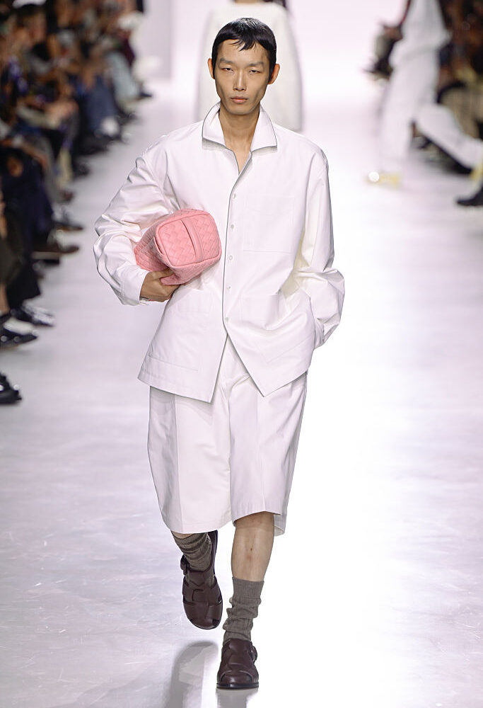Da Bottega Veneta, nella collezione primavera estate 2026, nonché la prima di Louise Trotter, il Cloud Dance appare in una decisamente comoda. Nonostante la camicia e i bermuda siano in pelle bianca, comunicano una coolness rilassata quanto conservatrice dell’eleganza italiana. È una versione inedita del fascino associato a questo colore.