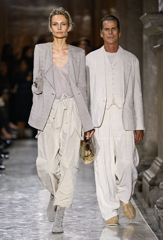 Invece, di eleganza classica ma destrutturata si è parlato nell’ultima collezione di Giorgio Armani, firmata dall’omonimo stilista. Re dell’eleganza, iniziatore del Made in Italy per come lo conosciamo oggi, alleato di una moda che sussurra e non punta sull’apparire. Il bianco detto Cloud Dance è da sempre nelle corde del marchio, tant’è che si potrebbe dire che Pantone si sia lasciata ispirare dalla sfilata primavera estate 2026 di Armani per decretare il colore dell’anno.