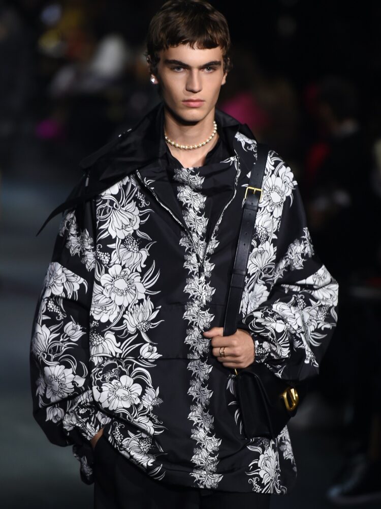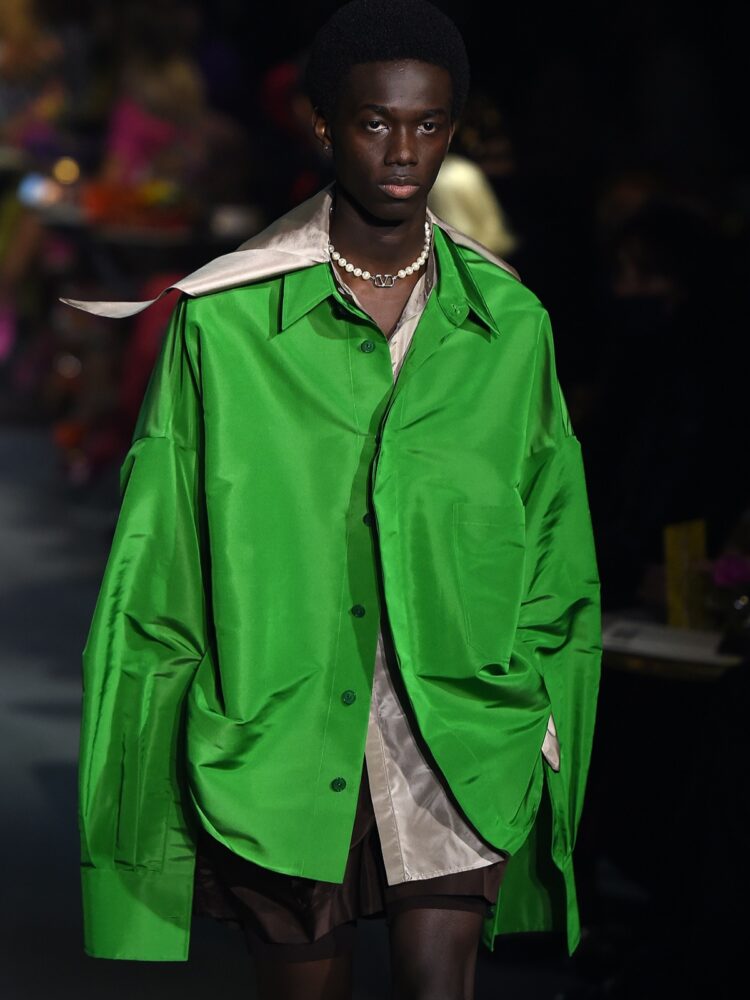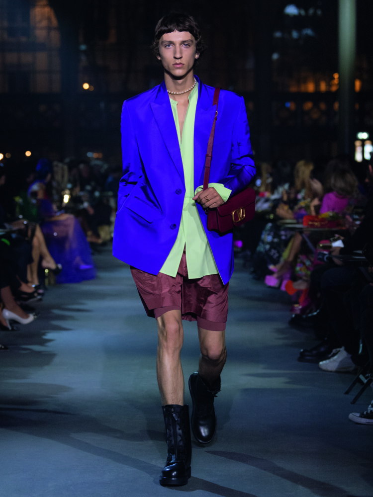 L’ossessione di Piccioli per la strada si riflette anche qui, è il luogo dove il sogno dello studio e dell’atelier diventano vita vera. L’activewear diventa prezioso per esaltare le fisicità facendo vedere il corpo attraverso flash di pelle. Il tailoring è inaspettatamente divertente con colori accesi e volumi nuovi come la cappa/cappotto. Anche la couture fa capolino, con il taffetà, ma è maltrattato e declinato in pezzi leisure come anorak, bermuda e camicie. Camicie che sono anche bianche ricamate e intarsiate come fossero hawaiane e portate con i jeans. Completa la proposta ‘Valentino Archive’ dove capi iconici sono stati rifatti e riproposti com’erano in origine: l’abitino bianco e il cappotto maculato di Marisa Berenson oppure i lunghi vestiti fiorati fotografati da Chris Von Wangenheim.