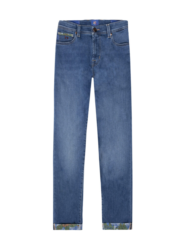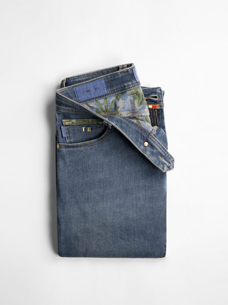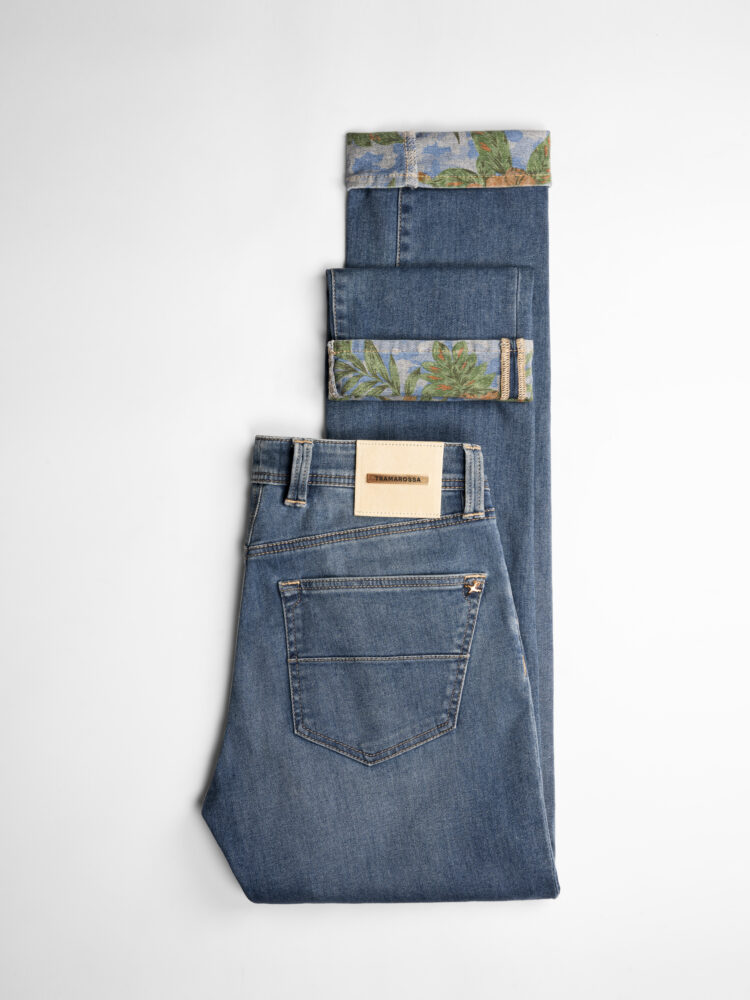 La stampa è interna al jeans, ma è visibile anche su alcuni dettagli esterni, come il profilo superiore del quinto taschino e l’etichetta posteriore. Jeans da indossare con il risvolto, per mostrare quel tocco inedito di colore, Tramarossa infatti è l’unica brand nel mondo denim a presentare capi realizzati con questa tecnica.