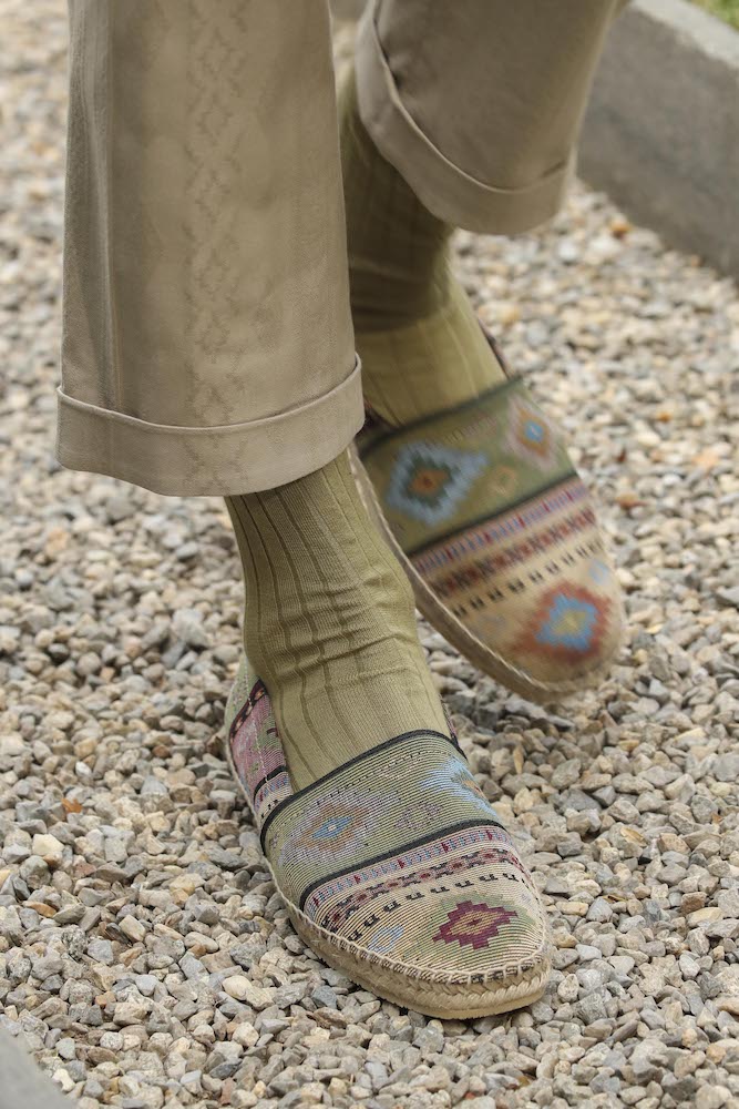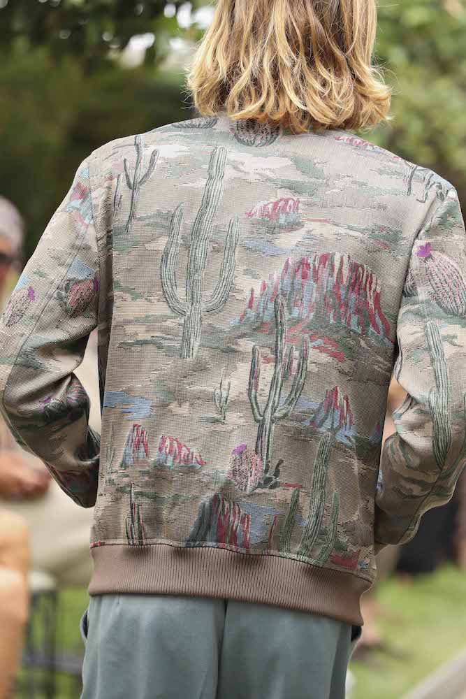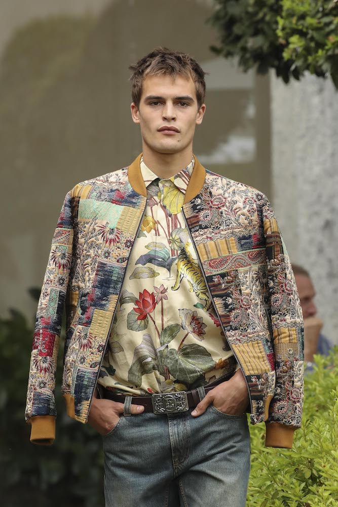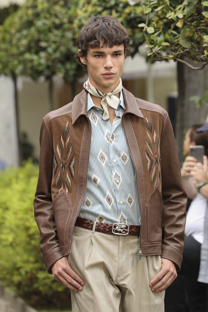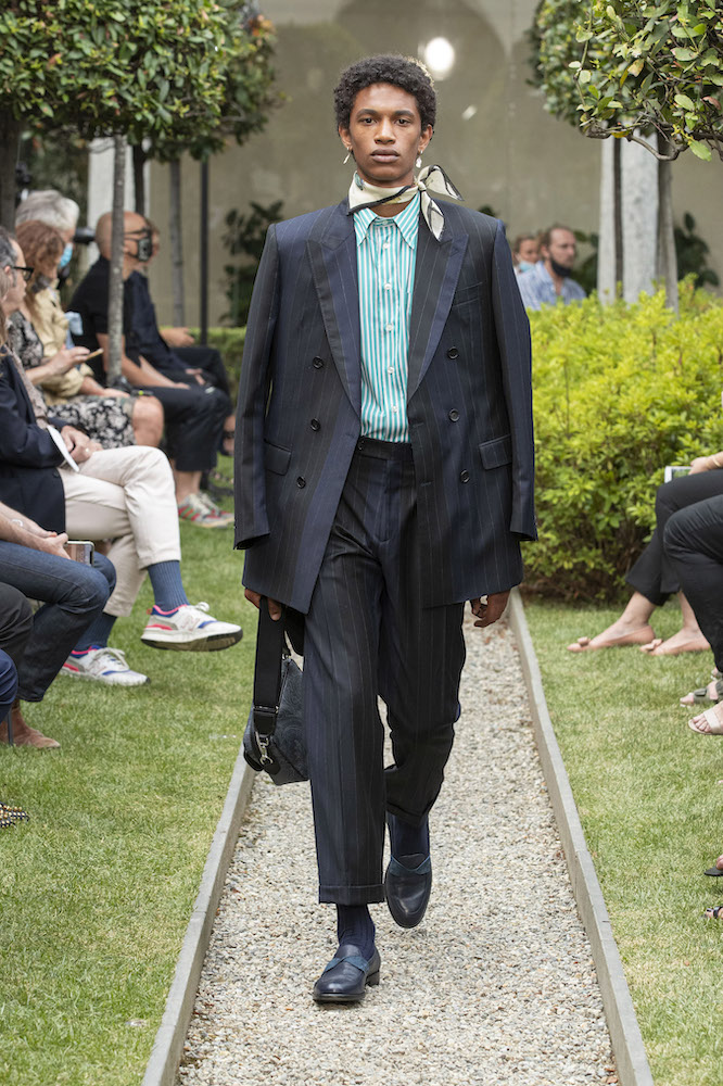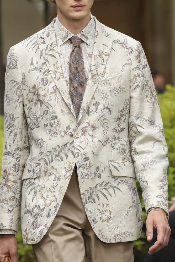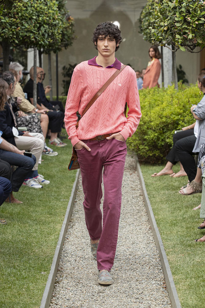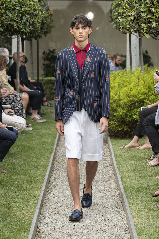 La sfilata ha reso omaggio al maestro Ennio Morricone, recentemente scomparso, e mentre l’Orchestra Ensemble Testori, guidata dal direttore artistico Giulia Sandoli, si esibiva dal vivo, i modelli hanno attraversato il giardino indossando abiti concreti, reali ma sempre caratterizzati da dettagli distintivi che ne valorizzano la personalità. Ecco righe, quadri Madras e l’immancabile motivo Paisley animare camicie e completi destrutturati, e ancora abiti sartoriali dai volumi rilassati completati da preziose cravatte d’archivio. Dal mondo della casa, invece, arrivano tessuti con fiori e animali selvatici che si alternano a patchwork grafici, mentre motivi camouflage diventano stampe allover su bermuda e leggere field jacket.